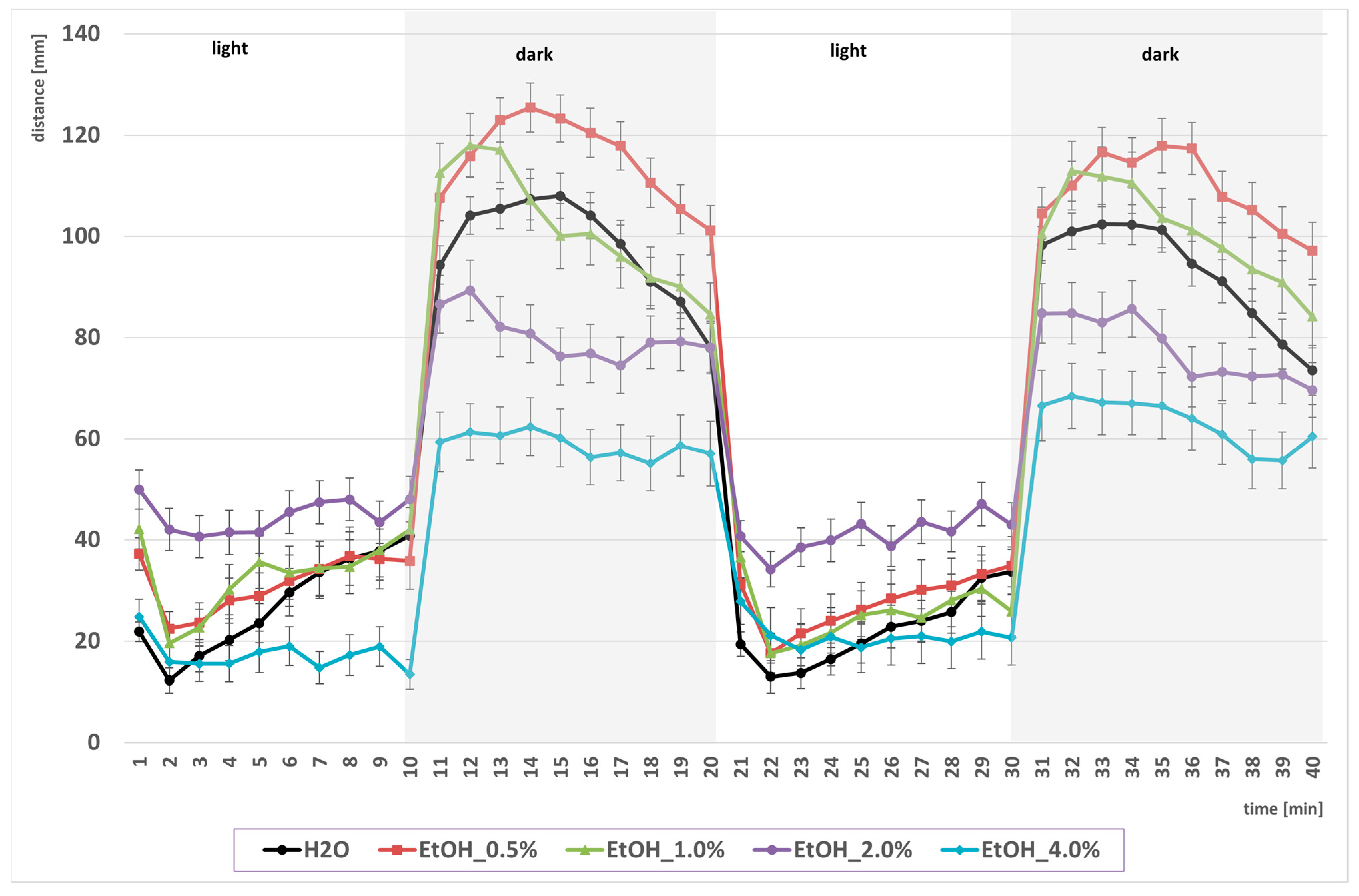 Experiments examining the effect of EtOH on the activity of D. rerio larvae were conducted during the light–dark cycle. However, the biphasic effect of EtOH was most evident during the dark phase, where the behavioral response was more pronounced and unambiguous. Therefore, to assess the effect of withanolides on the biphasic effect of EtOH, further experiments were analyzed during the dark phase.