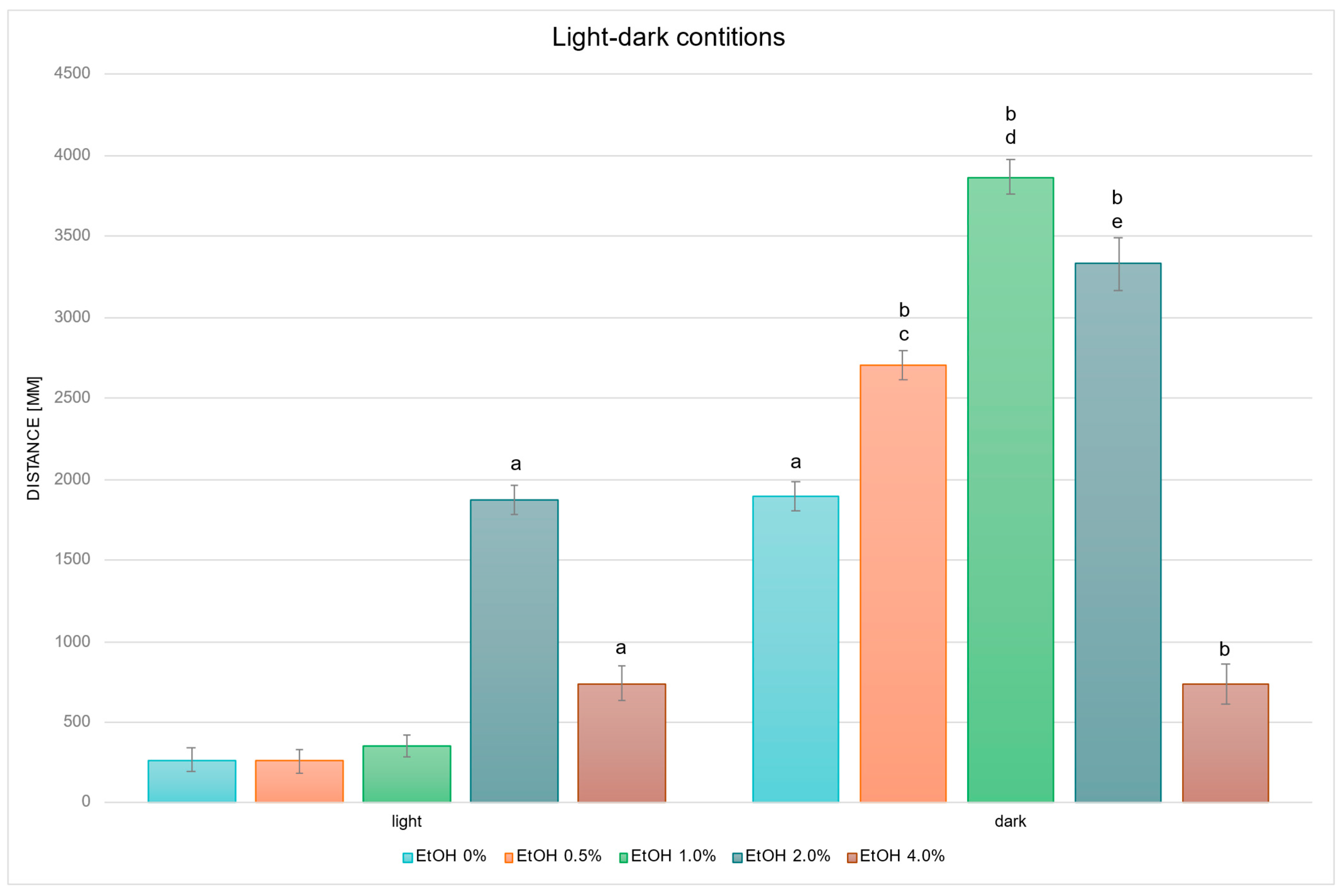 Effect of EtOH gradient on swimming distance of D. rerio larvae in light–dark conditions. Legend: a—vs. EtOH 0% light; b—vs. EtOH 0% dark; c—vs EtOH 0.5% light; d—vs. EtOH 1.0% light; e—vs. EtOH 2.0% light. All differences between groups were at the level: p < 0.05.