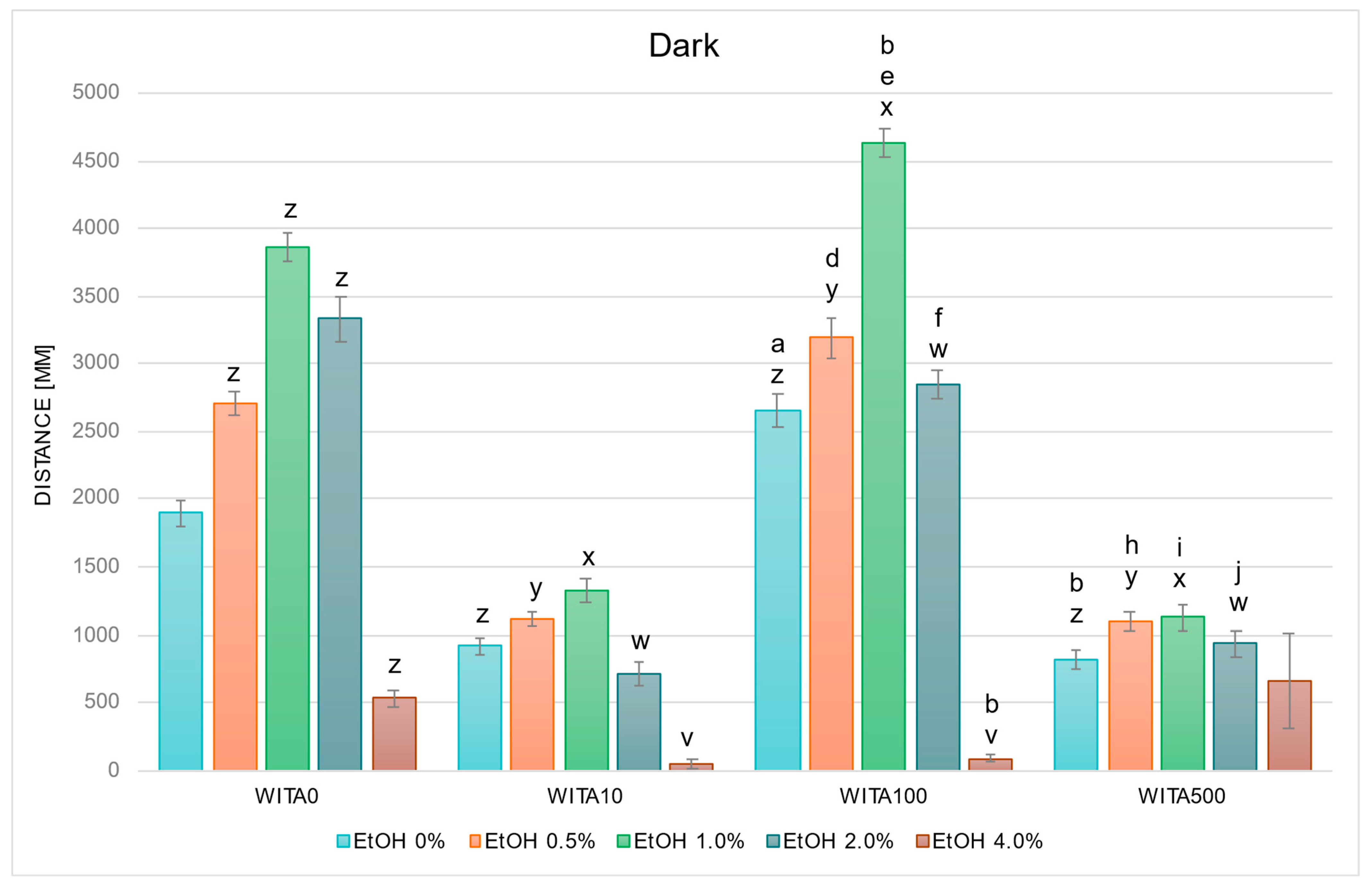 Effect of EtOH and WITA gradient on swimming distance of D. rerio larvae in dark conditions. Legend: z—vs. EtOH 0% WITA0; y—vs. EtOH 0.5% WITA0; x—vs. EtOH 1.0% WITA0; w—vs. EtOH 2.0% WITA0; e—vs. EtOH 1.0% WITA10; v—vs. EtOH 4.0% WITA0; a—vs. EtOH 0% WITA10; b—vs. EtOH 0% WITA100; d—vs. EtOH 0.5% WITA10; f—vs. EtOH 2.0% WITA10; h—vs. EtOH 0.5% WITA100; i—vs. EtOH 1.0%WITA100; j—vs. EtOH 2.0%WITA100. All differences between groups were at the level: p < 0.05.