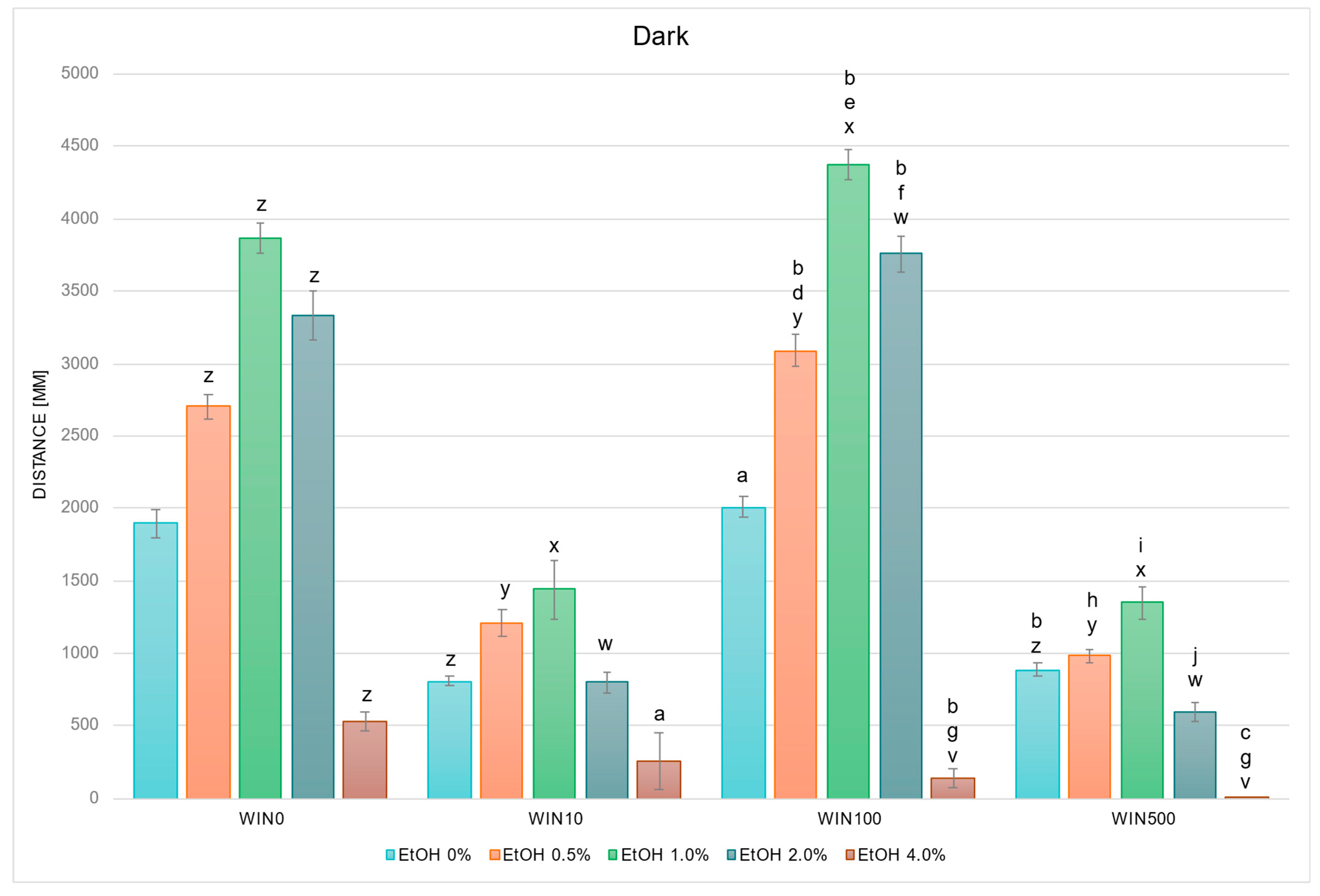 Effect of EtOH and WIN gradient on swimming distance of D. rerio larvae in dark conditions. Legend: z—vs. EtOH 0% WIN; y—vs. EtOH 0.5% WIN0; x—vs. EtOH 1.0% WIN0; w—vs. EtOH 2.0% WIN0; v—vs. EtOH 4.0% WIN0; a—vs. EtOH 0% WIN10; b—vs. EtOH 0% WIN100; c—vs. EtOH 0% WIN500; d—vs. EtOH 0.5% WIN10; e—vs. EtOH 1.0% WIN10; f—vs. EtOH 2.0% WIN10; g—vs. EtOH 4.0% WIN10; h—vs. EtOH 0.5% WIN100; i—vs. EtOH 1.0% WIN100; j—vs. EtOH 2.0% WIN100. All differences between groups were at the level: p < 0.05.