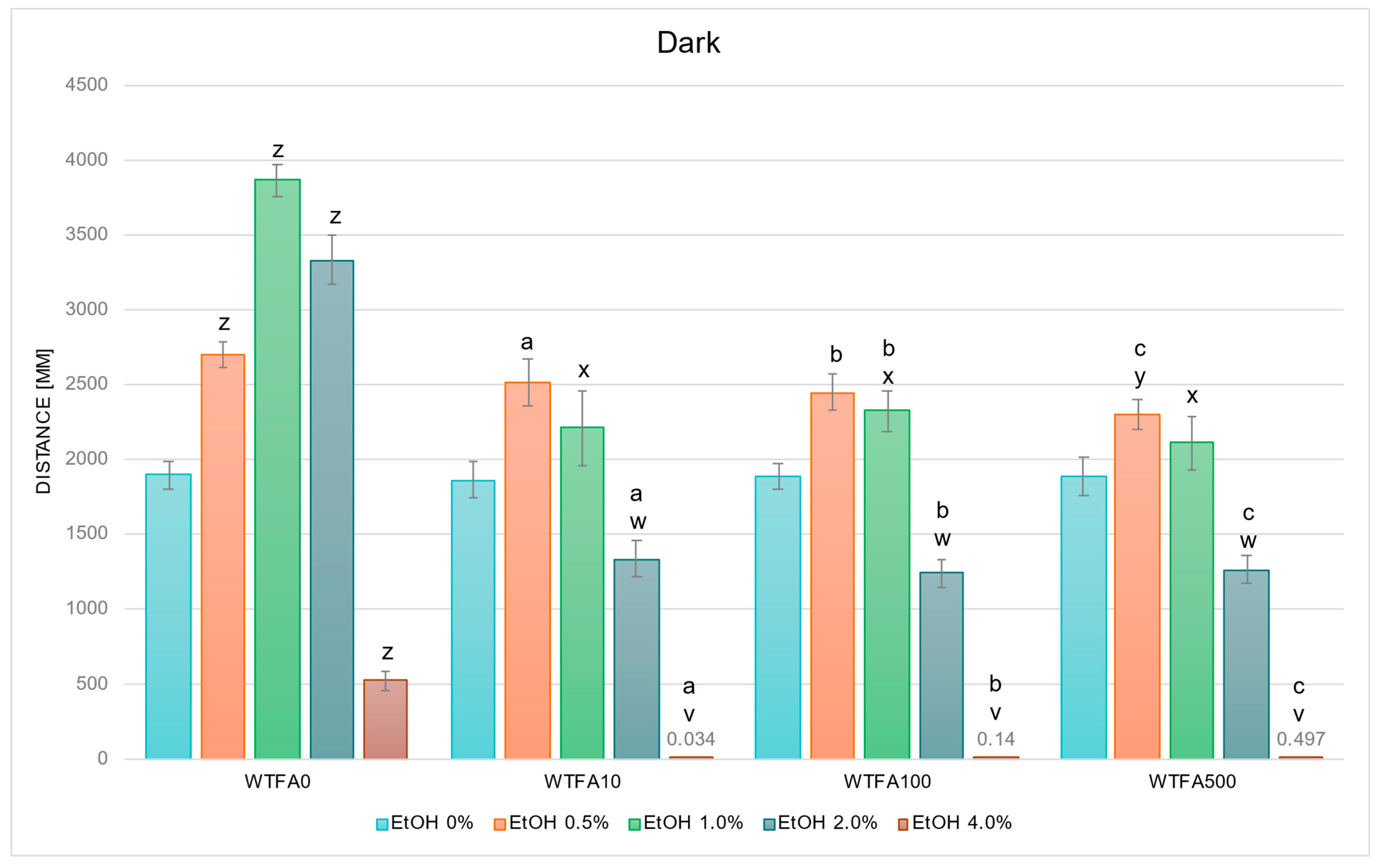 Effect of EtOH and WTFA gradient on swimming distance of D. rerio larvae in dark conditions. Legend: z—vs. EtOH 0% WTFA0; y—vs. EtOH 0.5% WTFA0; x—vs. EtOH 1.0% WTFA0; w—vs. EtOH 2.0% WTFA0; v—vs. EtOH 4.0% WTFA0; a—vs. EtOH 0% WTFA10; b—vs. EtOH 0% WTFA100; c—vs. EtOH 0% WTFA500. All differences between groups were at the level: p < 0.05.