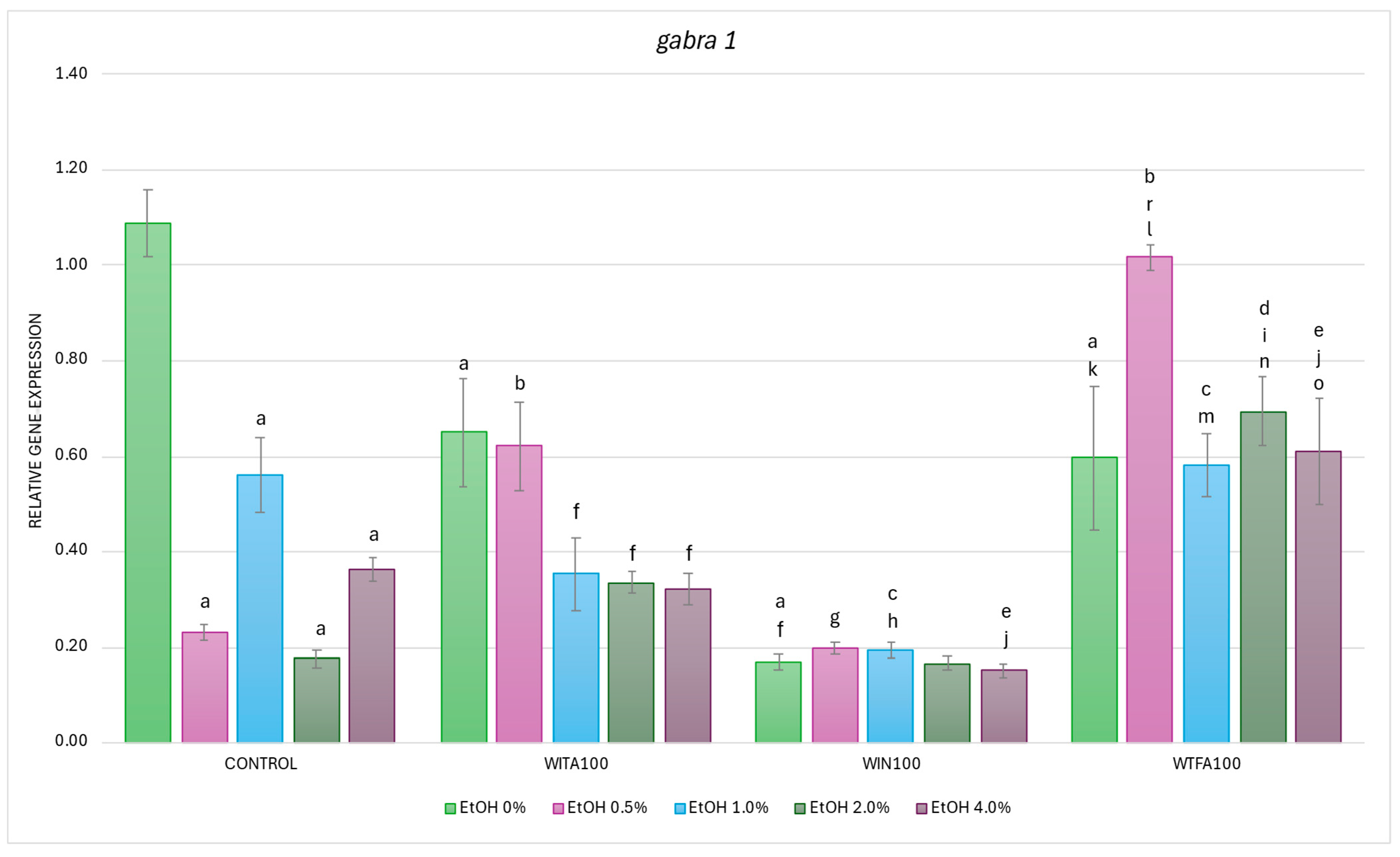Effect of WITA, WIN and WTFA on gabra1 mRNA expression in D. rerio larvae under the influence of an EtOH concentration gradient (0–4.0%). Legend: a—vs. Control (0% EtOH); b—vs. Control (0.5% EtOH); c—vs. Control (1.0% EtOH); d—vs. Control (2.0% EtOH); e—vs. Control (4.0% EtOH); f—vs. WITA (0% EtOH); g—vs. WITA (0.5% EtOH); h—vs. WITA (1.0% EtOH); i—vs. WITA (2.0% EtOH); j—vs. WITA (4.0% EtOH); k—vs. WIN (0% EtOH); l—vs. WIN (0.5% EtOH); m—vs. WIN (1.0% EtOH); n—vs. WIN (2.0% EtOH); o—vs. WIN (4.0% EtOH); r—vs. WTFA (0% EtOH). All differences between groups were at the level: p < 0.05.