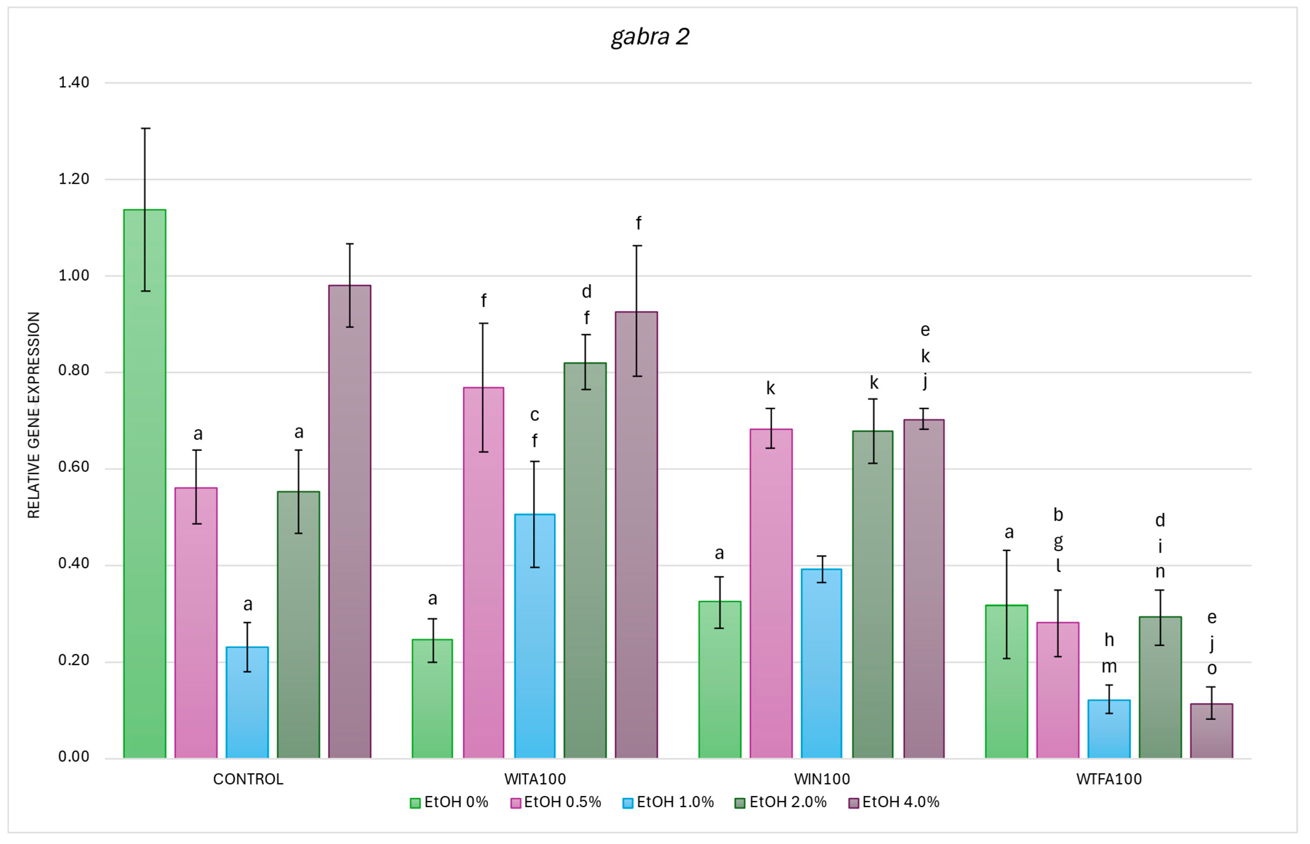 Effect of WITA, WIN and WTFA on gabra2 mRNA expression in D. rerio larvae under the influence of EtOH concentration gradient (0–4.0%). Legend: a—vs. Control (0% EtOH); b—vs. Control (0.5% EtOH); c—vs. Control (1.0% EtOH); d—vs. Control (2.0% EtOH); e—vs. Control (4.0% EtOH); f—vs. WITA (0% EtOH); g—vs. WITA (0.5% EtOH); h—vs. WITA (1.0% EtOH); i—vs. WITA (2.0% EtOH); j—vs. WITA (4.0% EtOH); k—vs. WIN (0% EtOH); l—vs. WIN (0.5% EtOH); m—vs. WIN (1.0% EtOH); n—vs. WIN (2.0% EtOH); o—vs. WIN (4.0% EtOH). All differences between groups were at the level: p < 0.05.