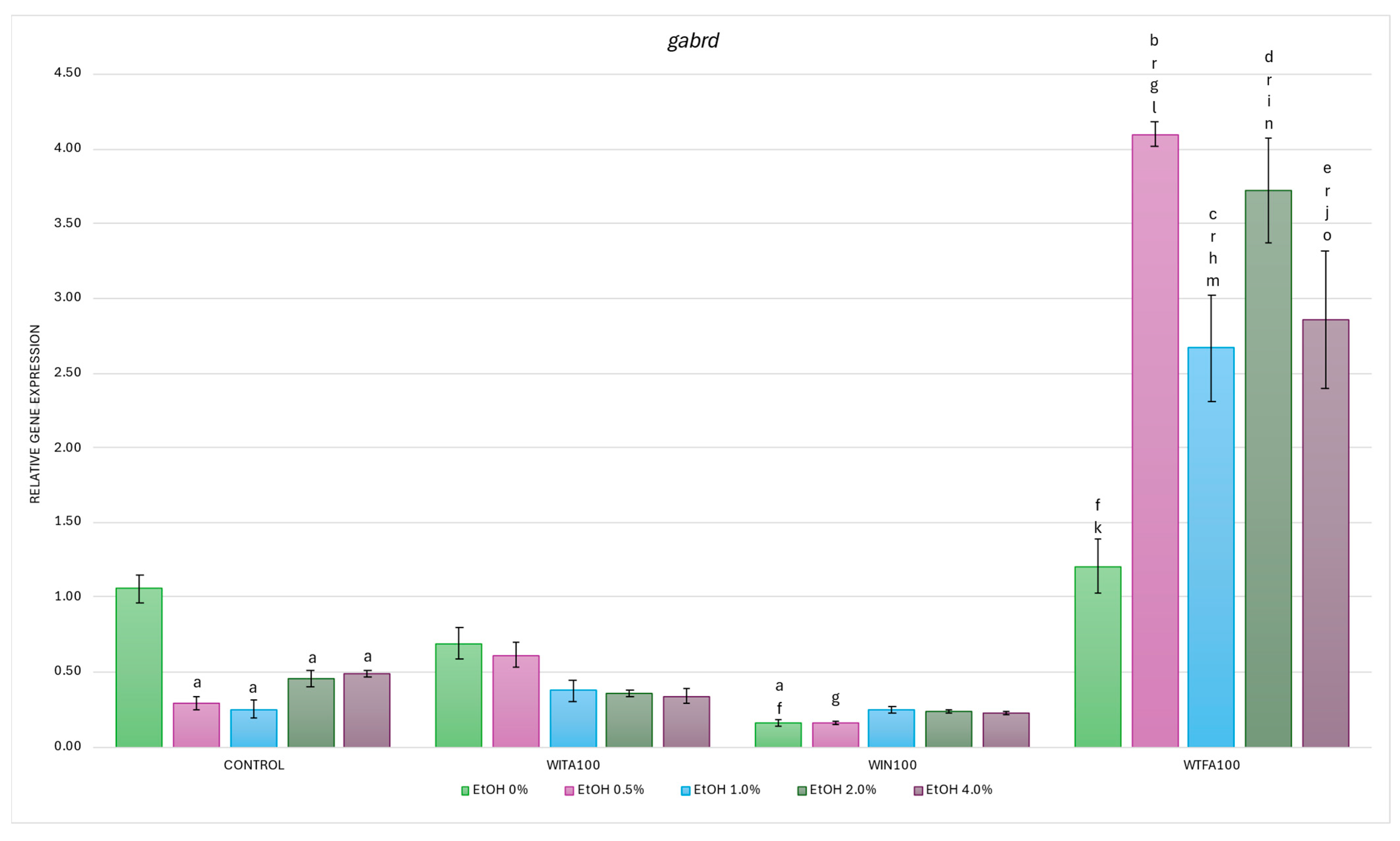 Effect of WITA, WIN and WTFA on gabrd mRNA expression in D. rerio larvae under the influence of EtOH concentration gradient (0–4.0%). Legend: a—vs. Control (0% EtOH); b—vs. Control (0.5% EtOH); c—vs. Control (1.0% EtOH); d—vs. Control (2.0% EtOH); e—vs. Control (4.0% EtOH); f—vs. WITA (0% EtOH); g—vs. WITA (0.5% EtOH); h—vs. WITA (1.0% EtOH); i—vs. WITA (2.0% EtOH); j—vs. WITA (4.0% EtOH); k—vs. WIN (0% EtOH); l—vs. WIN (0.5% EtOH); m—vs. WIN (1.0% EtOH); n—vs. WIN (2.0% EtOH); o—vs. WIN (4.0% EtOH); r—vs. WTFA (0% EtOH). All differences between groups were at the level: p < 0.05.