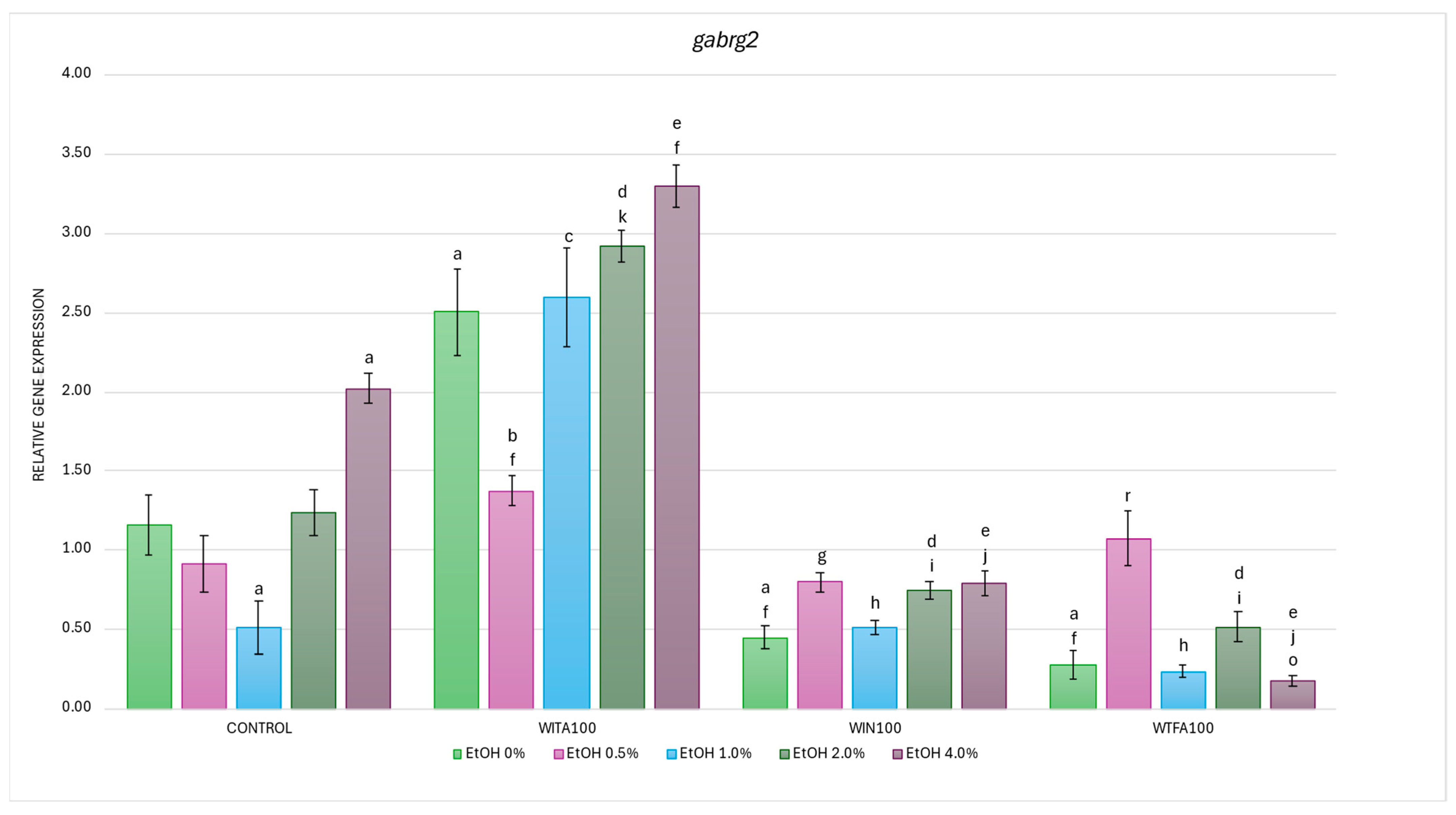 Effect of WITA, WIN and WTFA on gabrg2 mRNA expression in D. rerio larvae under the influence of EtOH concentration gradient (0–4.0%). Legend: a—vs. Control (0% EtOH); b—vs. Control (0.5% EtOH); c—vs. Control (1.0% EtOH); d—vs. Control (2.0% EtOH); e—vs. Control (4.0% EtOH); f—vs. WITA (0% EtOH); g—vs. WITA (0.5% EtOH); h—vs. WITA (1.0% EtOH); i—vs. WITA (2.0% EtOH); j—vs. WITA (4.0% EtOH); k—vs. WIN (0% EtOH); o—vs. WIN (4.0% EtOH); r—vs. WTFA (0% EtOH). All differences between groups were at the level: p < 0.05.