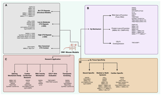 Several mouse models specific to cardiac and skeletal muscle involvement in DM1 are listed in Table 2 and Figure 2.