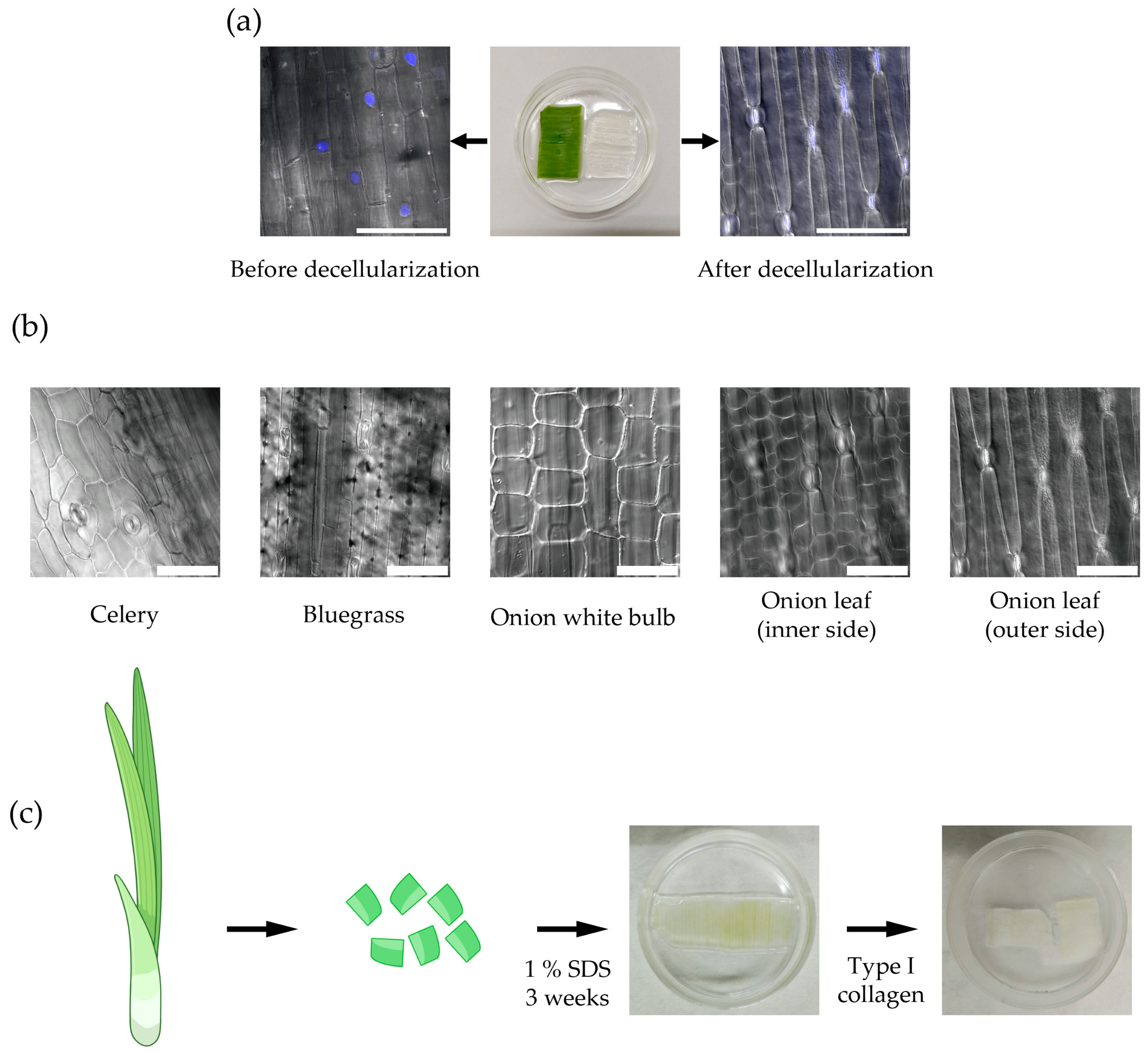 - Hasan, M.M.; Swapon, A.R.; Dipti, T.I.; Choi, Y.J.; Yi, H.G. Plant-Based Decellularization: A Novel Approach for Perfusion-Compatible Tissue Engineering Structures. J. Microbiol. Biotechnol. 2024, 34, 1003–1016. [Google Scholar] [CrossRef]