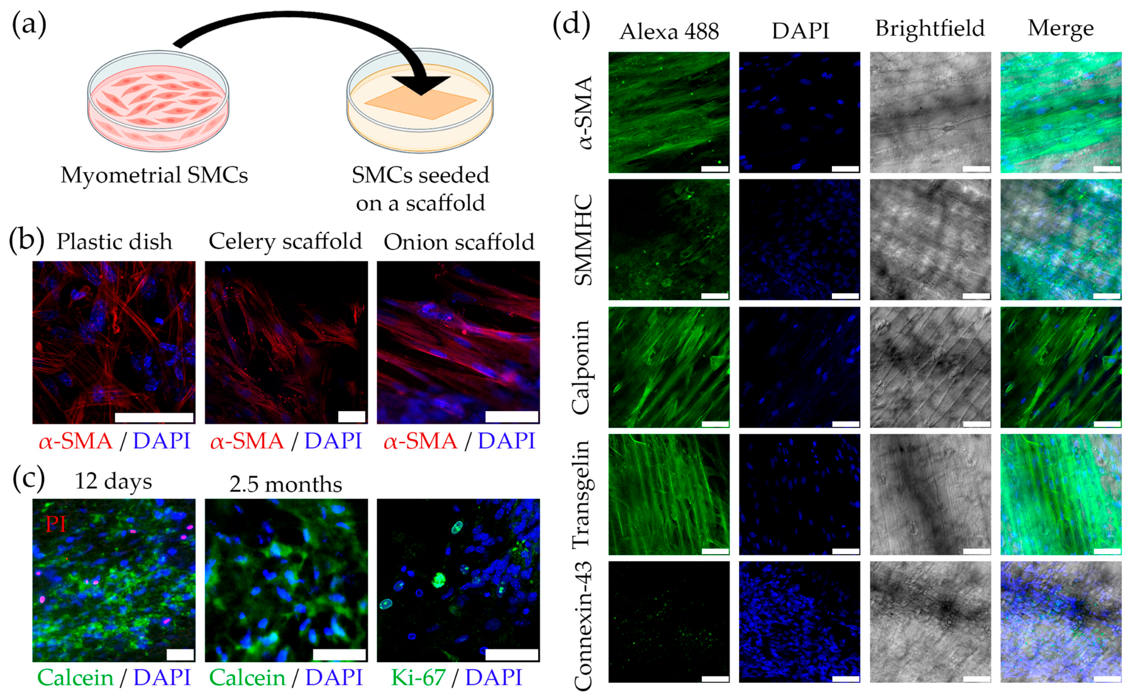 2.1. Plant-Derived Cellulose Scaffold for Myometrium Modeling In Vitro