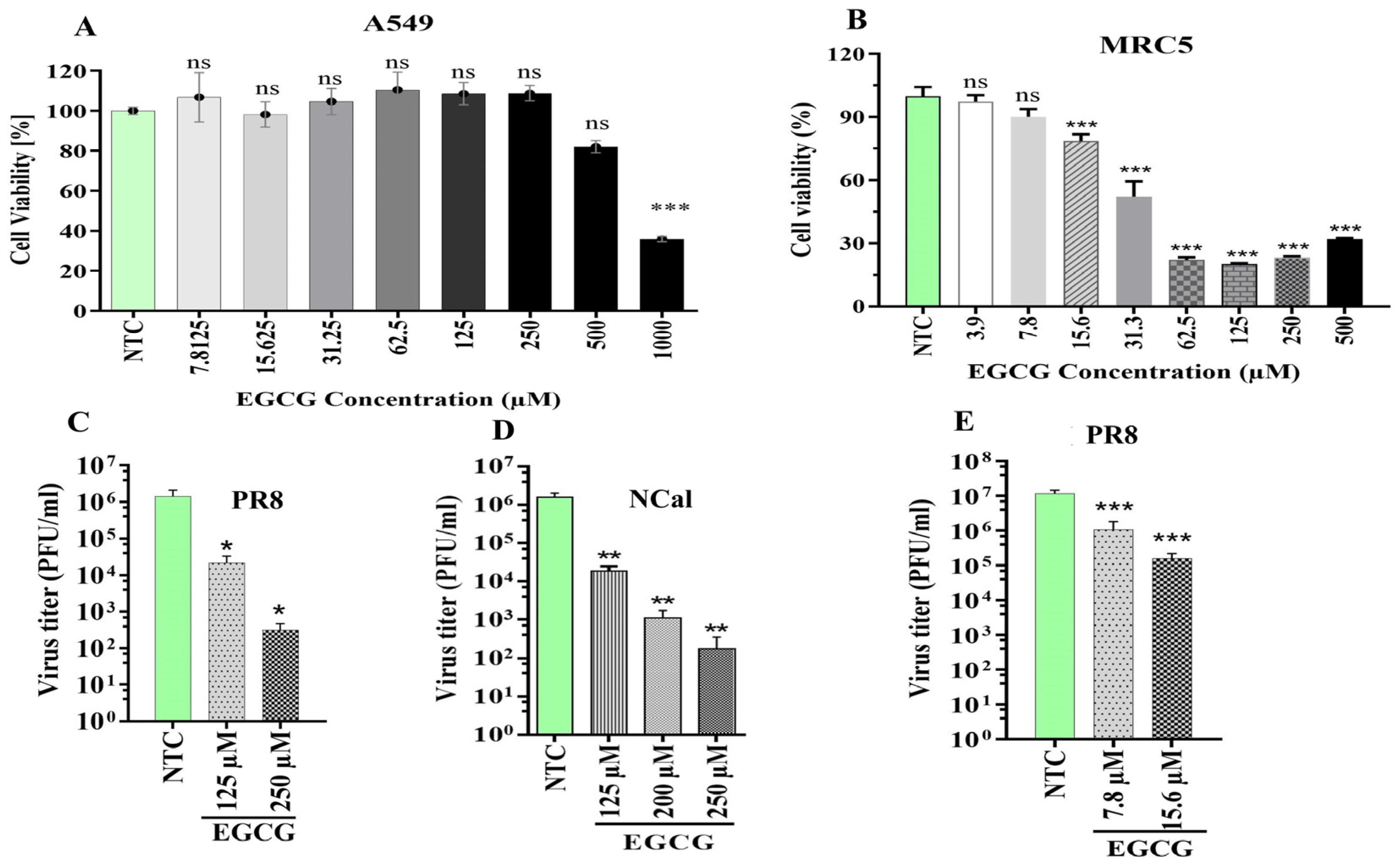 2.3. Inhibition of HSPA5 by Epigallocatechin-3-Gallate (EGCG) Suppresses IAV Replication