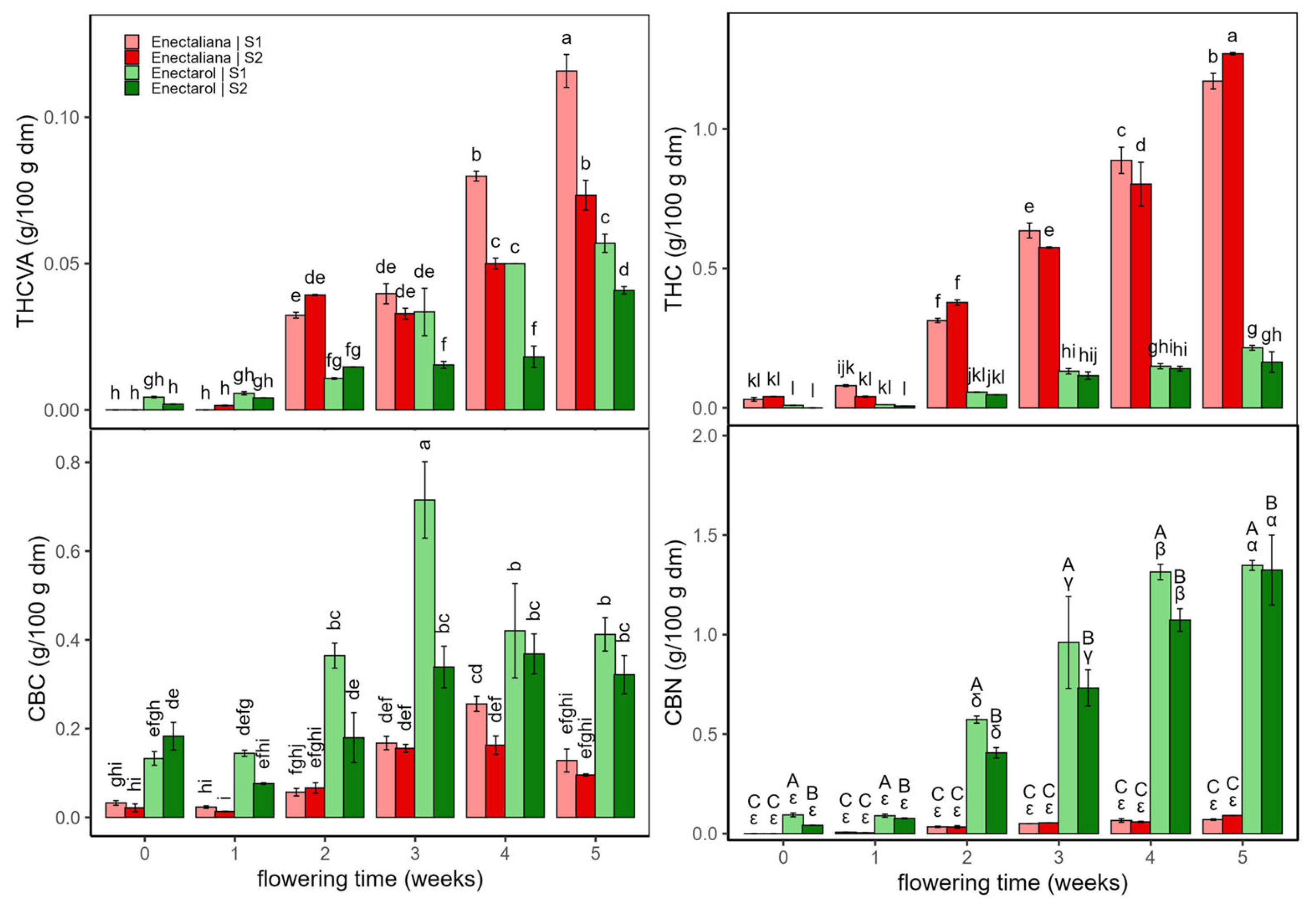 Figure 1. Psychoactive cannabinoids and related derivatives in Enectaliana and Enectarol cultivars from 0 to 5 flowering weeks for two planting densities (Sector 1 (S1) ≈ 2.3 plants m−2; Sector 2 (S2) ≈ 4.6 plants m−2): THCVA, THC, CBC and CBN. Different letters indicate significant differences (p < 0.05). Lowercase for Density × Time × Cultivar in THCVA, THC and CBC; uppercase (Density × Cultivar) and Greek (Time × Cultivar) in CBN.