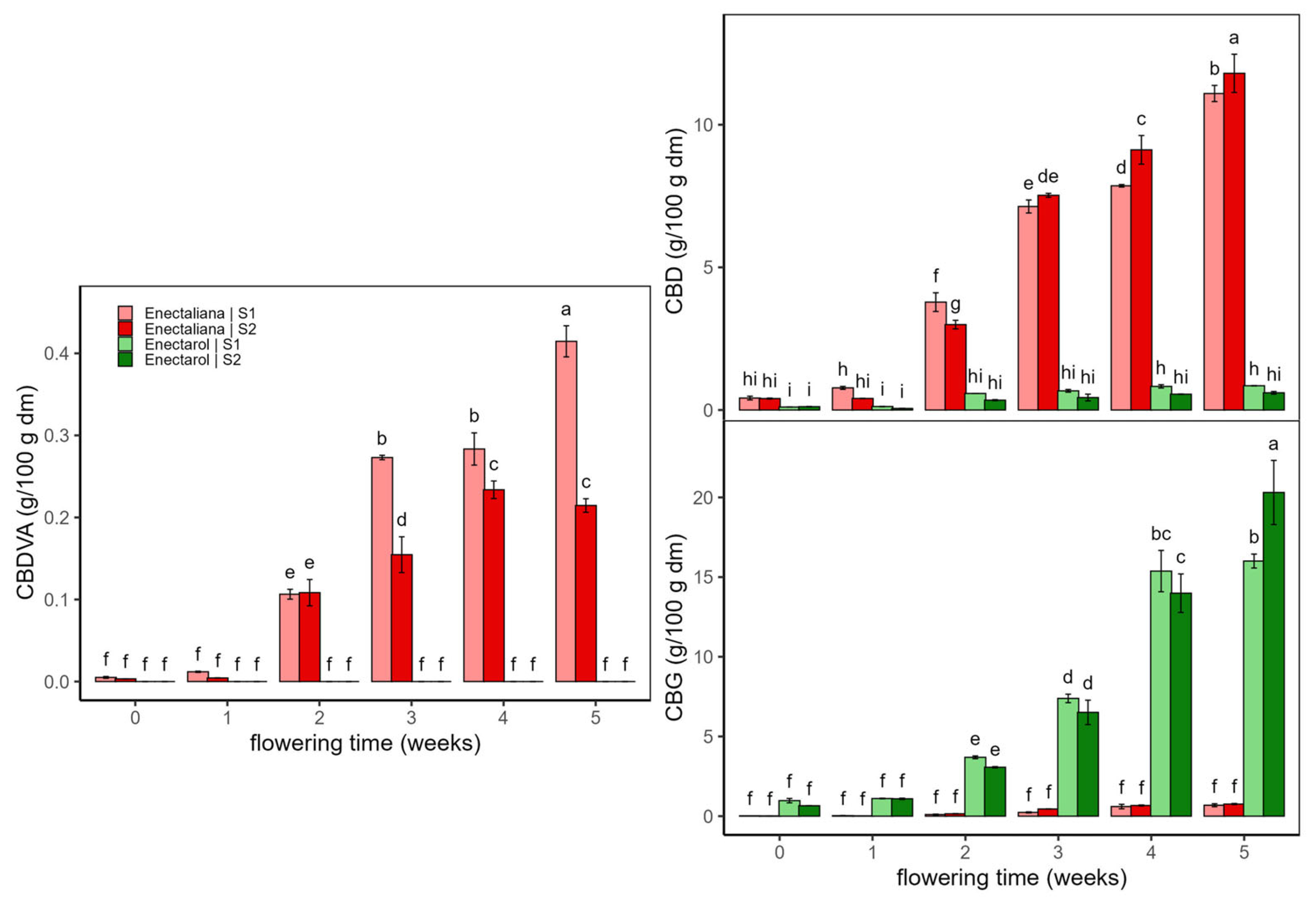 Figure 2. Non-psychoactive cannabinoids in Enectaliana and Enectarol cultivars from 0 to 5 flowering weeks for two planting densities (Sector 1 (S1) ≈ 2.3 plants m−2; Sector 2 (S2) ≈ 4.6 plants m−2): CBDVA, CBD and CBG. Different letters indicate significant differences (p < 0.05).