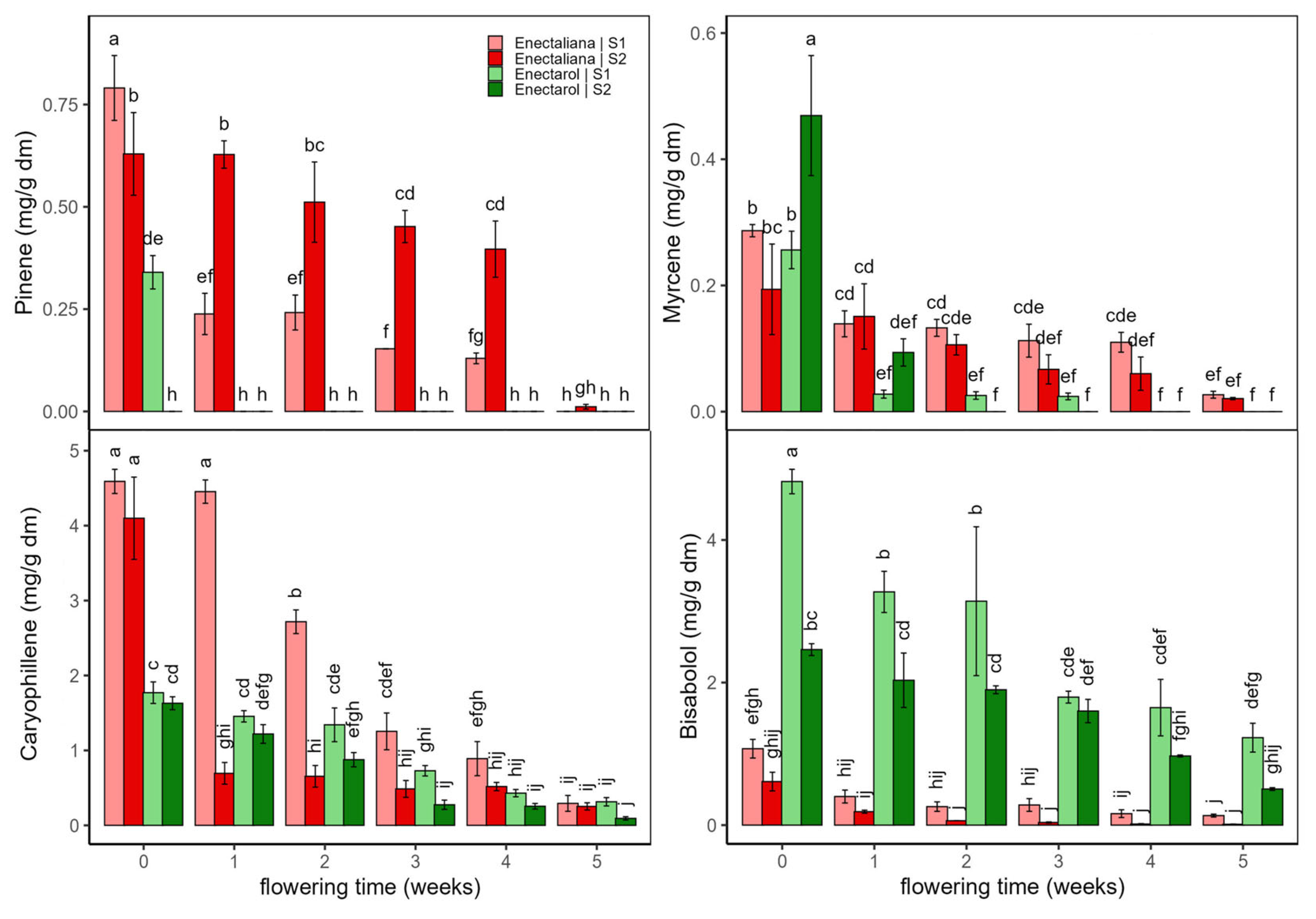 Figure 3. Terpene content (α-pinene, myrcene, caryophyllene, and bisabolol; mg/g dm) in Enectaliana and Enectarol cultivars from 0 to 5 flowering weeks for two planting densities (Sector 1 (S1) ≈ 2.3 plants m−2; Sector 2 (S2) ≈ 4.6 plants m−2). Different letters indicate significant differences (p < 0.05).