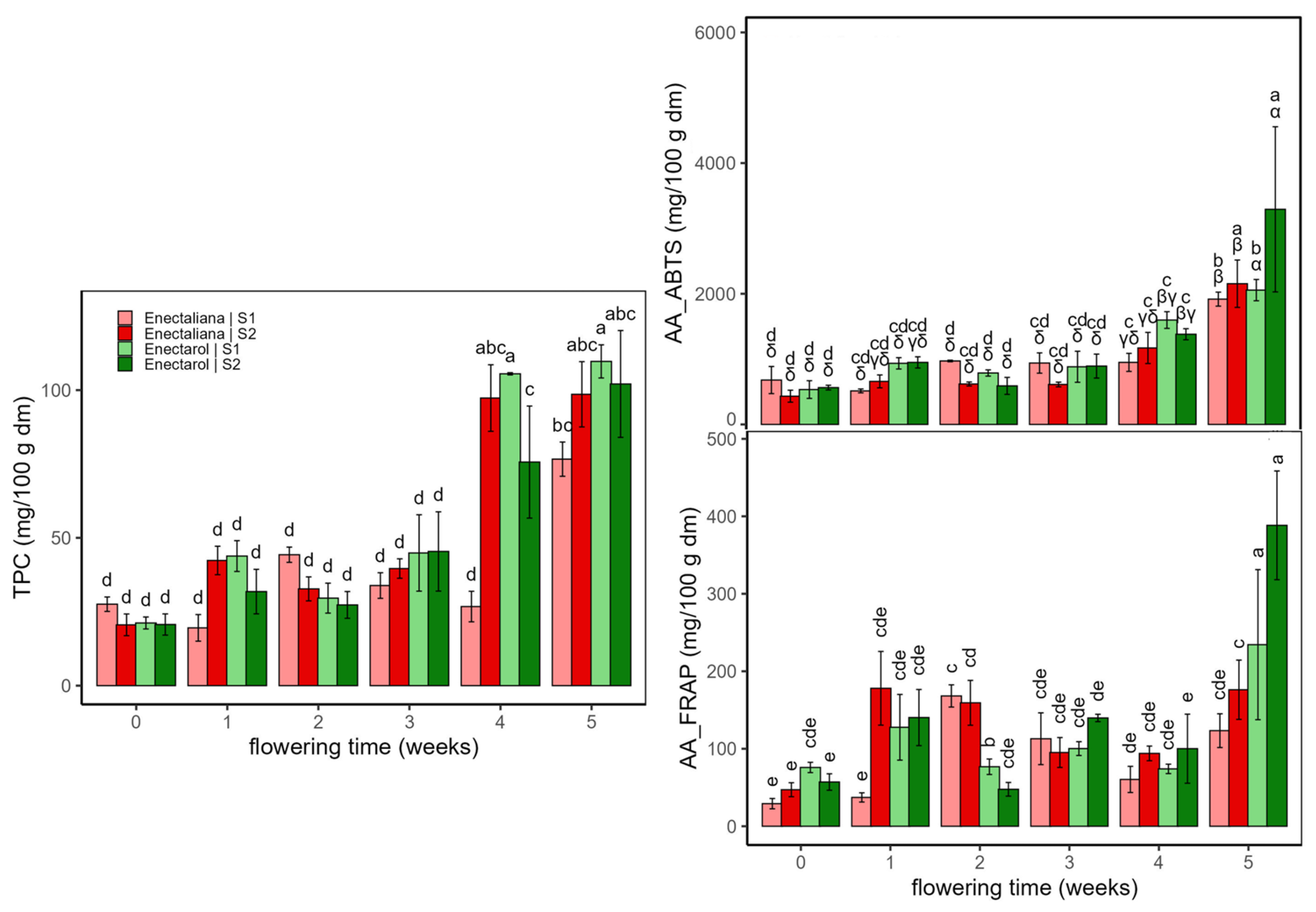Figure 4. Total polyphenol content (TPC, mg GAE/100 g dm) and antioxidant activity (AA: ABTS and FRAP, mg Trolox/100 g dm) in Enectaliana and Enectarol cultivars from 0 to 5 flowering weeks for two planting densities (Sector 1 (S1) ≈ 2.3 plants m−2; Sector 2 (S2) ≈ 4.6 plants m−2). Different letters indicate significant differences (p < 0.05) between samples of different factors. Lowercase for Density × Time × Cultivar in TPC and AA_FRAP; uppercase (Density × Time) and Greek (Time × Cultivar) in AA_ABTS.