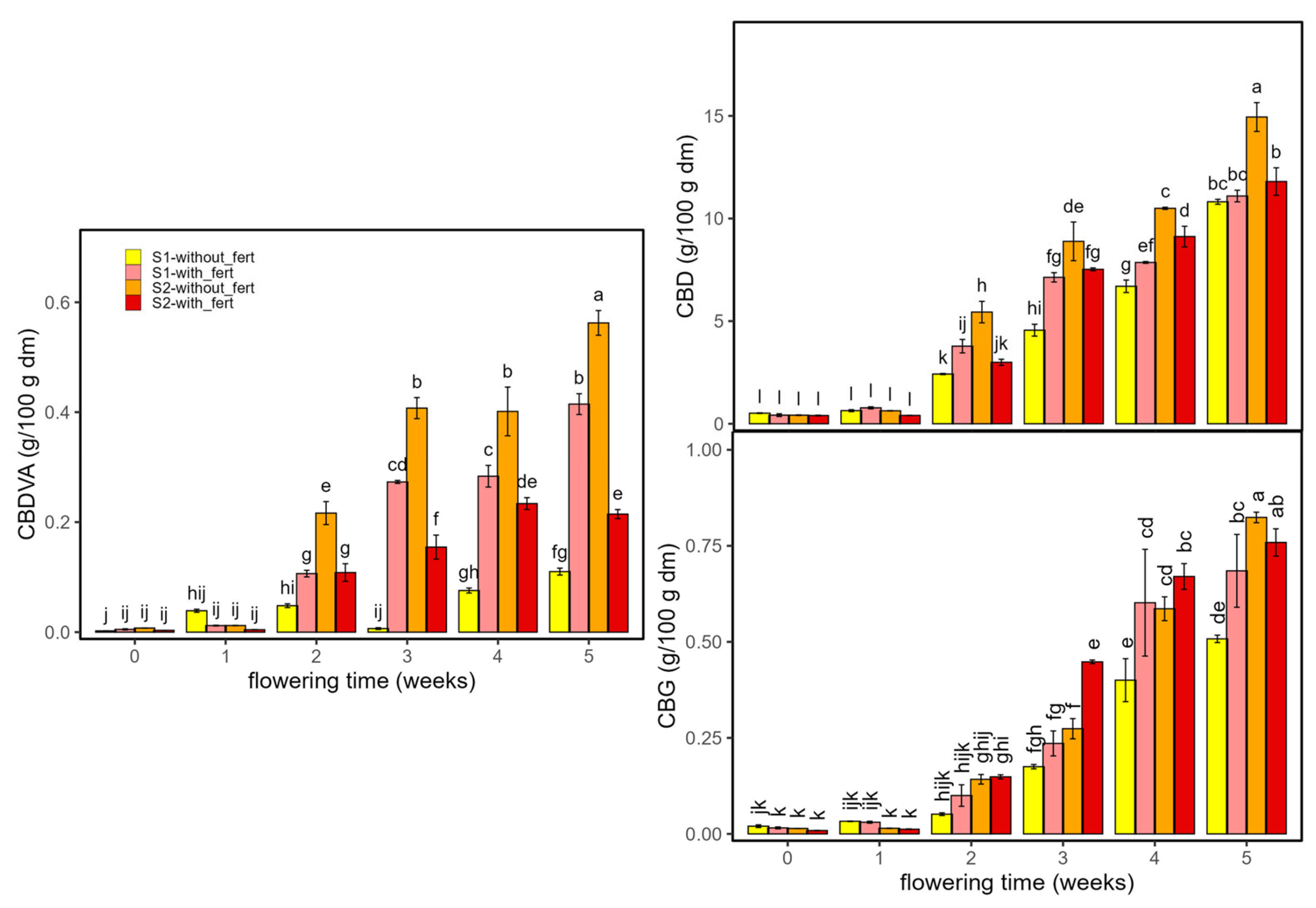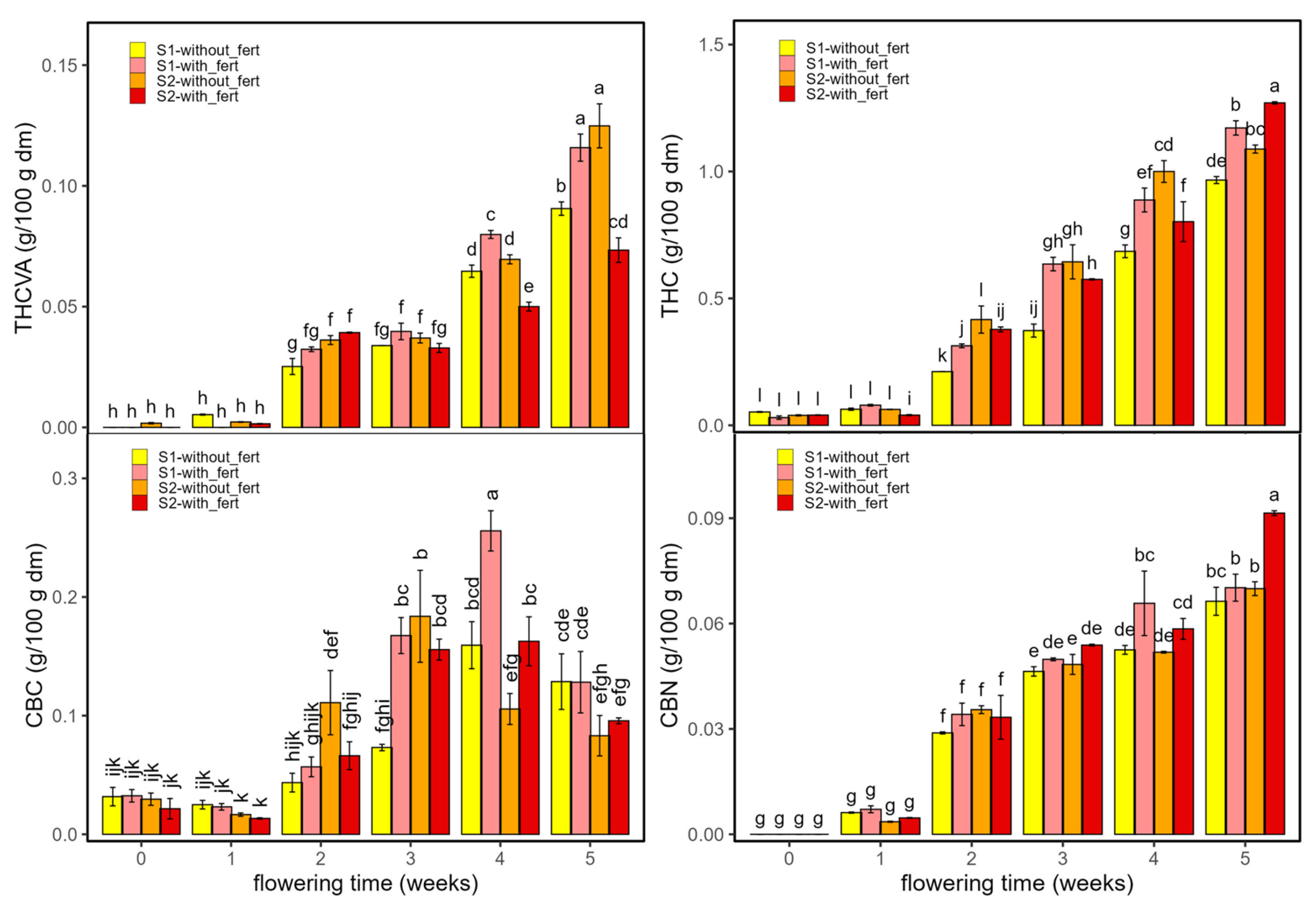 Figure 5. Psychoactive cannabinoids and related derivatives in Enectaliana cultivated with or without fertilizer, from 0 to 5 flowering weeks for two planting densities (Sector 1 (S1) ≈ 2.3 plants m−2; Sector 2 (S2) ≈ 4.6 plants m−2): THCVA, THC, CBC and CBN. Different letters indicate significant differences (p < 0.05).