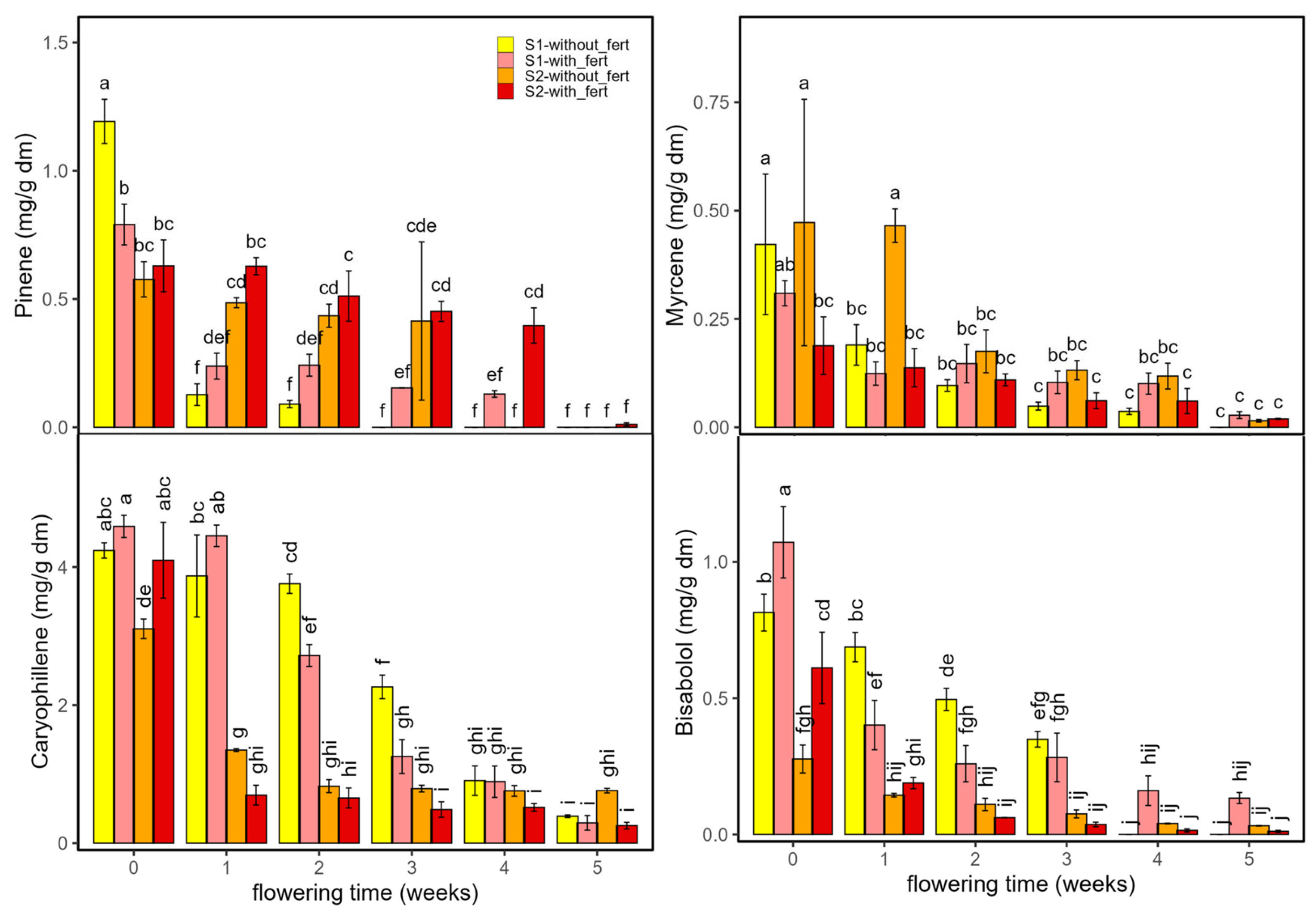 Figure 3 shows the evolution of α-pinene, myrcene, β-caryophyllene, and bisabolol across the two cultivars, Enectaliana and Enectarol, under the two planting densities. D-limonene results are not shown as concentrations were ≤0.08 mg/g dm under all conditions. As can be seen in Figure 3, the four terpenes peaked at flowering onset (week 0) and declined along the weeks.