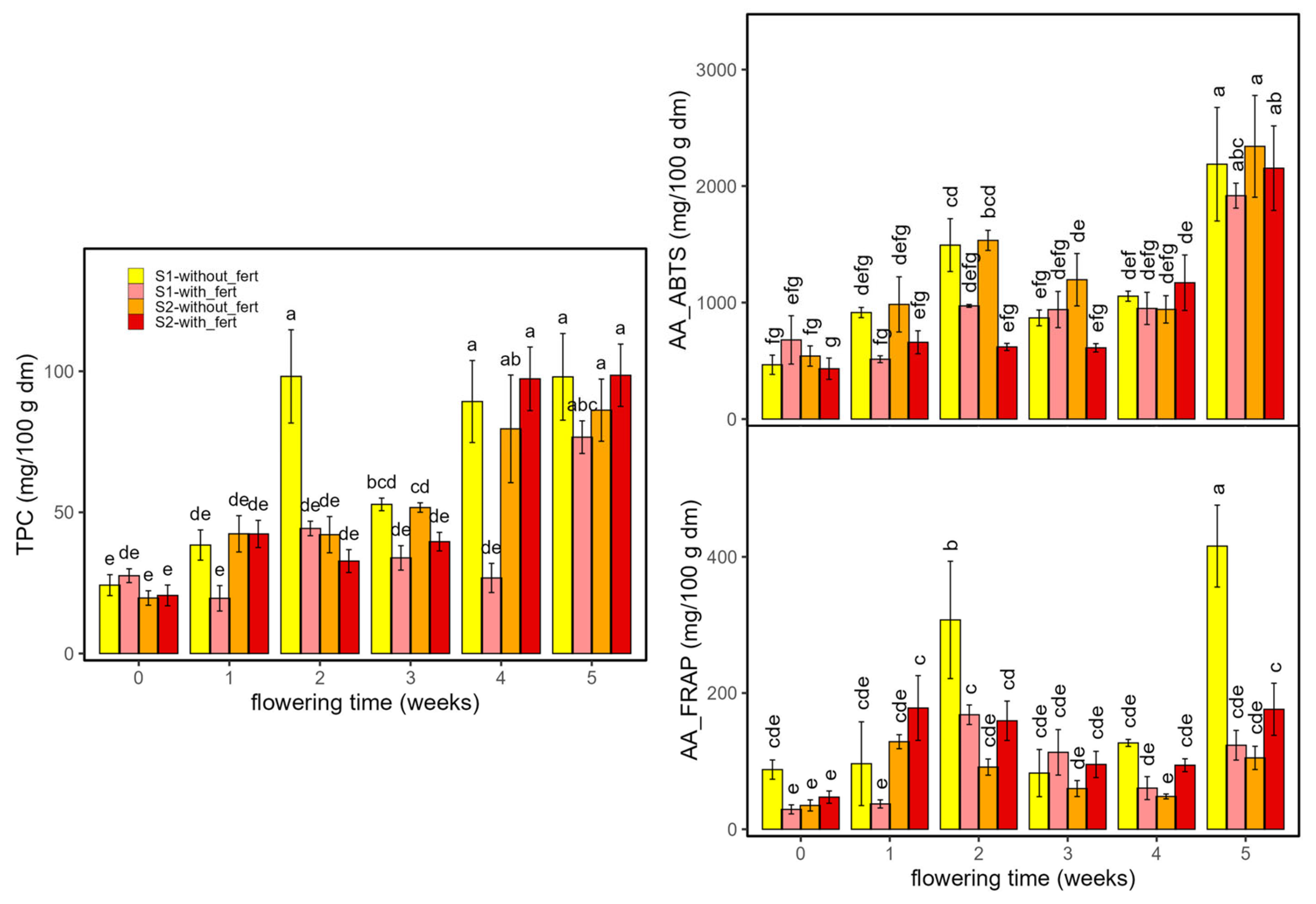 Total phenolics (TPC) were low and fairly stable through weeks 0–3 (mean 32.8 ± 10.7 mg/100 g dm), then rose sharply at weeks 4–5 across cultivars and densities. At week 4, TPC was higher in Enectarol, whereas Enectaliana–S2 lagged. By week 5, groups converged to high values (mean of 103.5 ± 12.0 mg/100 g dm), except for Enectaliana–S2 ending at 76.6 ± 5.8 mg/100 g dm. Within-week differences are indicated by Tukey’s HSD letter groupings in Figure 4.