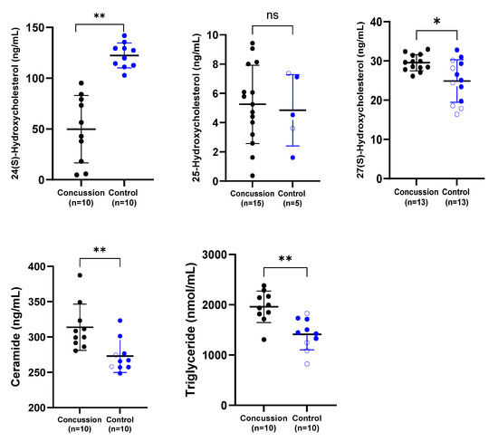 Comparison of serum concentrations of 24-HC, 25-HC, 27-HC, ceramide, and total triglycerides between the concussion and control groups. Each dot represents an individual participant, with bars indicating the median and range. Blue dots represent the control group, while black dots denote the concussion group. * p < 0.05; ** p < 0.01; ns = not significant.