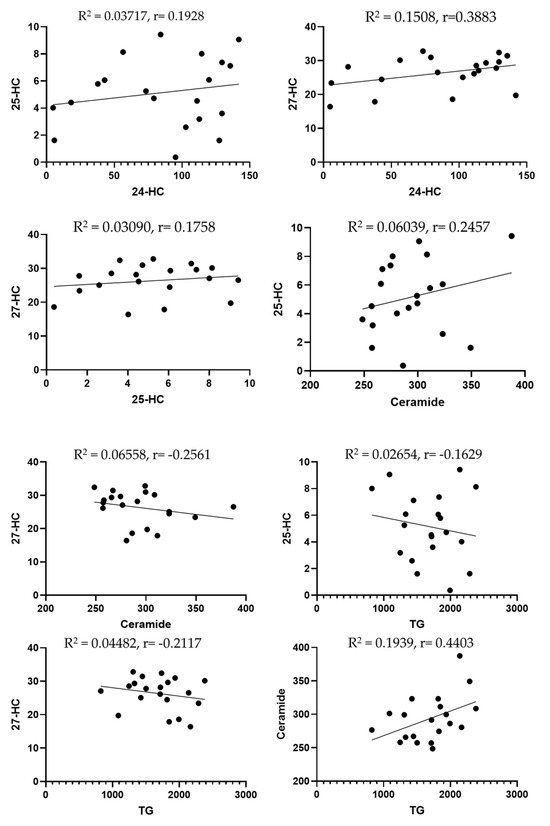 A standard Pearson’s correlation (regression) analysis was performed to examine the associations among all measured biomarkers. Unexpectedly, there were insignificant correlations between 24-HC levels and total 25-HC (R2 = 0.03717, p = 0.41); 24-HC and 27-HC (R2 = 0.1508, p = 0.09); 25-HC and 27-HC (R2 = 0.03090, p = 0.45); 25-HC and ceramide (R2 = 0.06039, p = 0.2963); 27-HC and ceramide (R2 = 0.06558, p = 0.27); 25-HC and triglycerides (R2 = 0.02654, p = 0.49); 27-HC and triglycerides (R2 = 0.04482, p = 0.37); ceramide and triglycerides (R2 = 0.1939, p = 0.052).