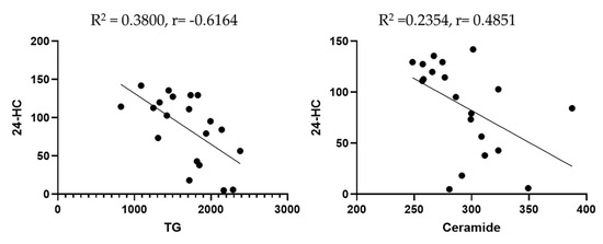 A significant inverse correlation was observed between reduced 24-HC levels and increased total triglycerides (R2 = 0.38, p = 0.003), as well as between lower 24-HC levels and elevated ceramide concentrations (R2 = 0.24, p = 0.03). (Figure 2).