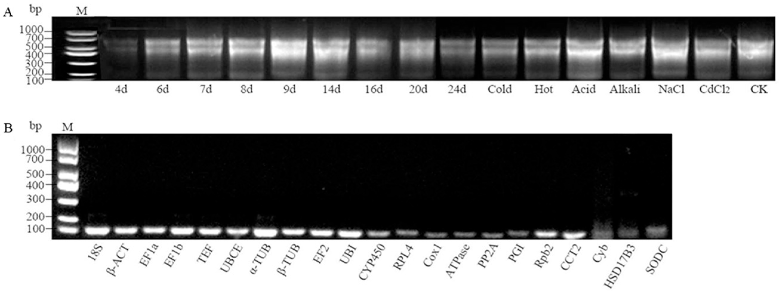 - Cao, L.; Zhang, Q.; Miao, R.; Zhao, X.; Ni, Y.; Li, W.; Feng, R.; Yang, D. Reference gene selection for quantitative real-time PCR analysis of Hymenopellis radicata under abiotic stress. Fungal Biol. 2024, 128, 1567–1577. [Google Scholar] [CrossRef]