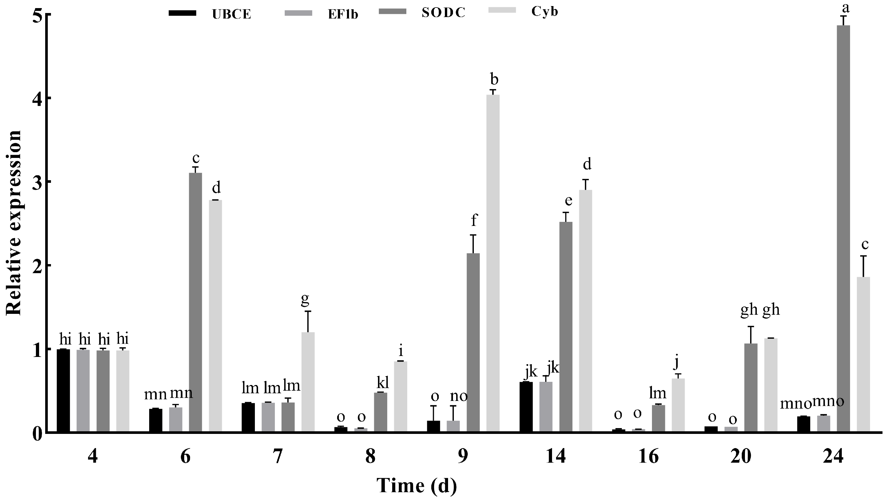 - Zhao, X.; Yang, H.; Chen, M.; Song, X.; Yu, C.; Zhao, Y.; Wu, Y. Reference gene selection for quantitative real-time PCR of mycelia from Lentinula edodes under high-temperature stress. Biomed. Res. Int. 2018, 2018, 1670328. [Google Scholar] [CrossRef]