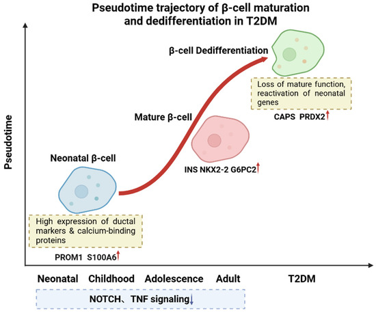 Pseudotime trajectory of β-cell maturation and dedifferentiation in T2DM. Developmental trajectory of β-cells progresses from neonatal to mature stages, with neonatal β-cells expressing genes such as PROM1 and S100A6 and mature β-cells expressing functional genes like INS and G6PC2. In T2DM, β-cells undergo dedifferentiation, reverting to an immature state and reactivating neonatal genes such as CAPS and PRDX2. During normal maturation, pathways like NOTCH and Tumor Necrosis Factor (TNF) signaling are gradually suppressed. Red arrows indicate upregulation; blue arrows indicate downregulation. Created in BioRender. Wei, Y. (2025) https://BioRender.com/j65al3o.