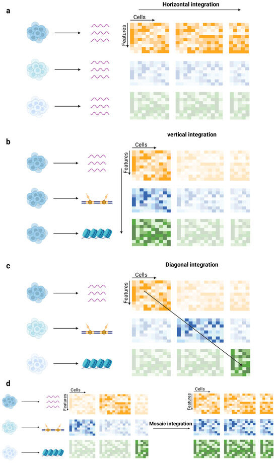 Data integration is an indispensable step in single-cell multi-omics studies, with the primary goal of effectively combining data from different sources or modalities [73]. Based on the characteristics of the data and the integration objectives, data integration can be categorized into four main strategies: horizontal integration, vertical integration, diagonal integration, and mosaic integration [74,75] (Figure 3).