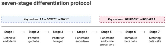 A major goal in diabetes treatment is the generation of large numbers of functional, transplantable β-cells from patient-derived pluripotent stem cells. Over the past decade, several in vitro protocols have been developed to differentiate human embryonic stem cells (hESCs) into pancreatic progenitors and further into functional stem cell-derived β-like cells (SC-β-cells) [85,95,96,97]. The application of single-cell multi-omics technologies has provided a new perspective for deciphering the molecular regulatory mechanisms underlying β-cell differentiation. For instance, Weng et al. [98] constructed a lineage tree comprising 95,308 single-cell transcriptomes, systematically revealing the entire differentiation trajectory from hESCs to β-like cells. The differentiation process was divided into multiple stages (S1–S7), as shown in Figure 4. In the early stages (S1–S4), the sequential activation of key embryonic markers (such as Brachyury (T), SRY-Box Transcription Factor 17 (SOX17), and Pancreatic and Duodenal Homeobox 1 (PDX1)) drove the formation of ref. [98] pancreatic progenitor cells; in the later stages (S5–S7), the expression of endocrine progenitor-specific genes (such as Neurogenin 3 (NEUROG3), INS, and Islet Amyloid Polypeptide (IAPP)) laid the foundation for the functional maturation of β-like cells. These findings provide critical insights into the multi-stage gene expression patterns during differentiation.