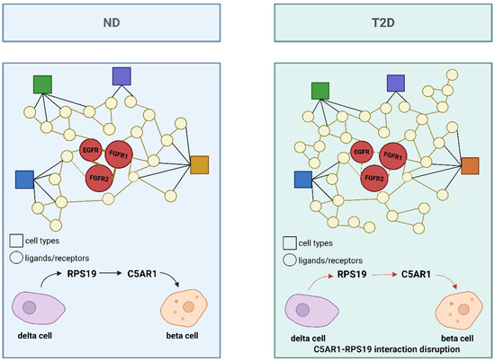 Islet interactome in ND and T2DM states. The interactome compares ligand–receptor interactions in ND and T2DM islets. In ND islets, interactions such as RPS19-C5AR1 between β and δ cells are maintained, contributing to islet homeostasis. In T2DM islets, the number of ligand–receptor interactions increases, but the C5AR1-RPS19 interaction is disrupted, potentially leading to reduced insulin secretion and increased apoptosis. Circles represent ligands/receptors, and squares represent cell types. Different colors represent distinct cell types. Solid lines indicate preserved or strengthened ligand–receptor interactions, whereas dashed lines represent weakened or disrupted interactions. Created in BioRender. Wei, Y. (2025) https://BioRender.com/o24sy55.