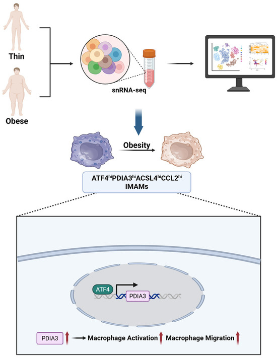 Identification of IMAMs in obesity-associated adipose tissue. snRNA-seq reveals a distinct macrophage subpopulation (ATF4hiPDIA3hiACSL4hiCCL2hi IMAMs) enriched in obese visceral fat, with activation of pro-inflammatory and metabolic dysregulation pathways. The bottom panel shows ATF4-PDIA3-driven macrophage activation and migration. Created in BioRender. Wei, Y. (2025) https://BioRender.com/sr89vhu.