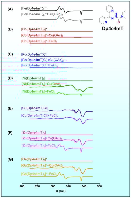 Complexes of Fe(III), Co(III), Pd(II), Ni(II), Cu(II), Zn(II), and Ga(III) with the ligand Dp4e4mT (shown at right) exhibitdistinct EPR profiles upon exposure to competing metals (Cu(II) or Fe(III)), defining the thermodynamic hierarchy of metal exchange. The emergence of Cu(II) signals confirms that Cu(II) efficiently displaces other metals, highlighting the high transmetalation propensity and redox flexibility of this system. (A) [Fe(Dp4e4mT)2]⁺ before and after addition of Cu(OAc)2; (B) [Co(Dp4e4mT)2]⁺ before and after addition of Cu(OAc)2 or FeCl3; (C) [Pd(Dp4e4mT)Cl] before and after addition of Cu(OAc)2 or FeCl3; (D) [Ni(Dp4e4mT)2] before and after addition of Cu(OAc)2 or FeCl3; (E) [Cu(Dp4e4mT)Cl] before and after addition of FeCl3; (F) [Zn(Dp4e4mT)2] before and after addition of Cu(OAc)2 or FeCl3; and (G) [Ga(Dp4e4mT)3]⁺ before and after addition of Cu(OAc)2 or FeCl3. Reproduced with permission from the Royal Society of Chemistry. Originally published in Chemical Science []. Copyright © 2024 Royal Society of Chemistry.