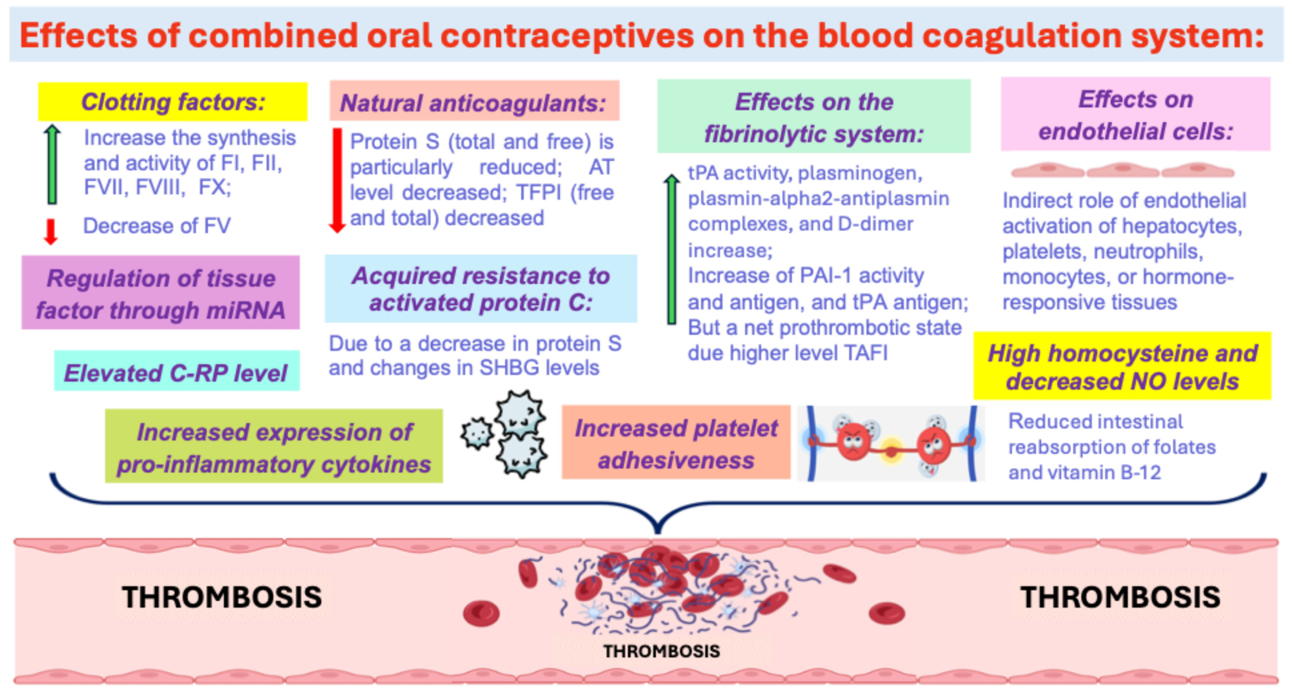 | Activation of coagulation cascade | Increased synthesis of procoagulant factors (FII, FVII, FVIII, FX, fibrinogen) leading to hypercoagulability | Estrogen-dependent; most pronounced with third-generation progestins |