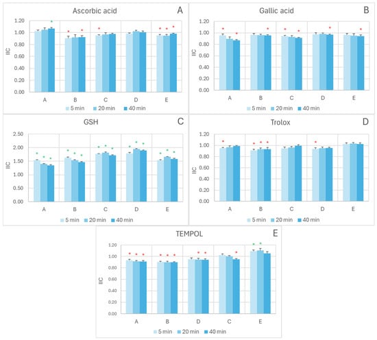 Effect of reagent ratio and reaction time on the integrated interaction coefficient (IIC) in the exogenous antioxidant/red cabbage extract systems measured by the ABTS• decolorization assay. The concentrations of antioxidants introduced to the wells (1–6 µL) were as follows: (A)-A, 0.04 mM AC, 1.6 mM ascorbic acid; (A)-B, 0.08 mM AC, 1.2 mM ascorbic acid; (A)-C, 0.12 mM AC, 0.8 mM ascorbic acid; (A)-D; 0.12 mM AC, 0.4 mM ascorbic acid; (B)-A: 0.04 mM AC, 0.4 mM gallic acid; (B)-B, 0.08 mM AC, 0.3 mM gallic acid; (B)-C, 0.12 mM AC, 0.2 mM gallic acid; (B)-D, 0.16 mM AC, 0.1 mM gallic acid; (C)-A, 0.04 mM AC, 0.8 mM GSH; (C)-B, 0.08 mM AC, 0.6 mM GSH; (C)-C, 0.12 mM AC, 0.4 mM GSH; (C)-D, 0.16 mM AC, 0.2 mM GSH; (D)-A, 0.04 mM AC, 1.44 mM Trolox; (D)-B, 0.08 mM AC, 1,08 mM Trolox; (D)-C, 0.12 mM AC, 0.72 mM Trolox; (D)-D, 0.16 mM AC, 0.36 mM Trolox; (E)-A, 0.04 mM AC, 40 mM TEMPO; (E)-B, 0.08 mM AC, 30 mM TEMPOL; (E)-C, 0.12 mM AC, 20 mM TEMPOL; (E)-D, 0.16 mM AC, 10 mM TEMPOL. Reaction time: 1, 30, and 60 min. * p < 0.05 with respect to additive interaction (IIC = 1) (one-tailed Student “t” test). Green asterisks indicate synergic interaction, red asterisks denote antagonistic interaction; the lack of an asterisk indicates additive interaction. AC, anthocyanins.