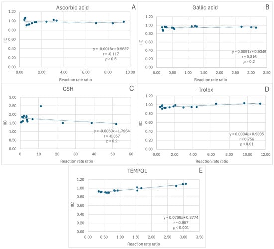 The dependence of the IIC on the extract/antioxidant reaction rate ratio was not significant for gallic acid and glutathione (Figure 2B,C), negative for ascorbic acid and Trolox (correlation coefficients statistically significant, p < 0.01 and p < 0.05, respectively; Figure 2A,D), and positive for TEMPOL (correlation coefficient statistically significant, p < 0.01, Figure 2E).
