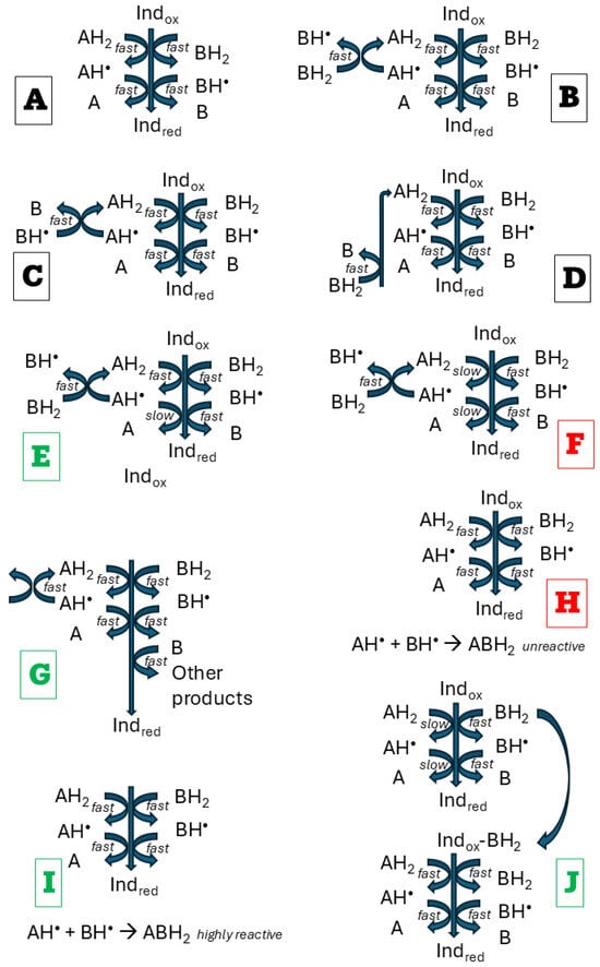 The main possible effects of interactions between antioxidants undergoing two-step oxidation: maintenance of additivity (black), synergy (green), and antagonism (red). Indox, oxidized indicator; Indred, reduced indicator. (A), no interaction between antioxidants AH2 and BH2; (B,C), regeneration antioxidant AH2 by reduction of one-electron oxidation products of AH2; (D), regeneration of AH2 by reduction of two-electron oxidation product of AH2 by BH2; (E), regeneration of antioxidant AH2 from its weakly reactive one-electron oxidation product of leads to synergy; (F), consumption of an antioxidant reacting with the indicator for the regeneration of another antioxidant weakly reactive with the indicator leads to antagonism; (G), faster consumption of BH2 due to regeneration of AH2 enables a greater participation of still reactive B in the reduction of the indicator, leading to synergy; (H,I), reaction between one-electron oxidation products of both antioxidants leads to antagonism if the reaction product is not reactive (H) or synergy if the product is hyperreactive (I,J), complexing the indicator by one antioxidant facilitates the reduction of the indicator by another antioxidant.