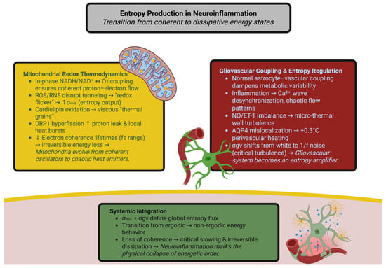 While neuroinflammation is typically considered due to cytokine cascades, reactive oxygen species, and mitochondrial dysfunction, it represents the end result of a larger problem related to energy: the lack of predictability in the energy used by mitochondria, transported throughout the glial–vascular system and dissipated [1]. Under normal conditions, the brain maintains a rhythmic energy homeostasis in contrast to being stationary. Therefore, oxidative phosphorylation by mitochondria, glycolysis by astrocytes, ion fluxes, and vasomotor oscillations functionally synchronize to create reversible energy flow where the entropy produced by neural computations is returned via both mitochondrial and vascular feedback mechanisms [2,3,4]. As a result, the synchronized interaction between oxygen flux, heat produced, and synaptic computations maintains a dynamic equilibrium state. However, inflammation occurs once the typical time frames for oxidation, perfusion, and electrical signal transduction lose synchronization [5].