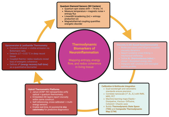 Nanothermometric framework for mapping thermodynamic biomarkers. This schematic integrates optical, quantum, and mechanical nanosensing modalities for detecting energetic disorder in neuroinflammation. The central node represents thermodynamic biomarkers—quantifiable signatures of entropy, energy flow, and redox coherence in living tissue.