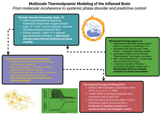 Astrocytes, microglia, and endothelial cells act as a dynamic entropic controller that links metabolic activity and perfusion. In normal conditions, Ca2+-dependent gliotransmission and pericyte contraction help to dampen metabolic variability; however, inflammation turns this controller into a random amplifier. Astrocytic Ca2+ waves lose spatial coherence and propagate at velocities reduced from hundreds of micrometers to tens of micrometers, and their correlation function changes from a power law to exponential decay—indicating the breaking down of self-similarities [30,31,32]. Perfusion signals become chaotic; cytokine-induced nitric oxide/endothelin co-phasing breaks down vascular resonance and creates micro-thermal wall fluctuations [33]. Astrocytic swelling and aquaporin-4 mislocalization increase the residence time of heat around the vessels by over 60% and therefore raise the temperature by 0.2–0.3 °C during chronic inflammation [34]. Impaired removal and altered solubility of gases enhance feedback instability [35]. Therefore, gliovascular coupling transforms from a damped to a resonant behavior, its dissipation spectrum (σgv) changing from white to 1/f noise with long-range correlations characteristic of critical turbulence [36,37,38]. Such long memory characteristics of behavioral manifestations of the transitional state of stability to irreversible decay are thermodynamically comprehensible in entropy–power metrics’ methodology of fluctuations of temperature and flow [39]. Figure 1 illustrates how the brain’s energy system transitions from being coherent to being dissipative due to a neuroinflammatory response. The entropic effects of mitochondrial redox instability and gliovascular desynchronization serve as coupled sources of entropy in the brain that disrupt both proton–electron balance and vascular thermoregulation. Together these two provide the conditions for a systemic transition from reversible energy flow to irreversible heat loss—a thermodynamic hallmark of neuroinflammatory degradation.