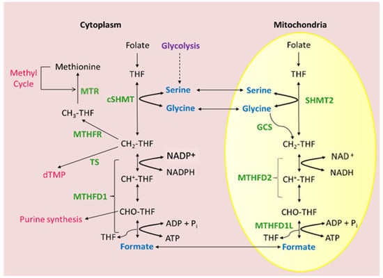 - Zheng, Y.; Cantley, L.C. Toward a better understanding of folate metabolism in health and disease. J. Exp. Med. 2019, 216, 253–266. [Google Scholar] [CrossRef]