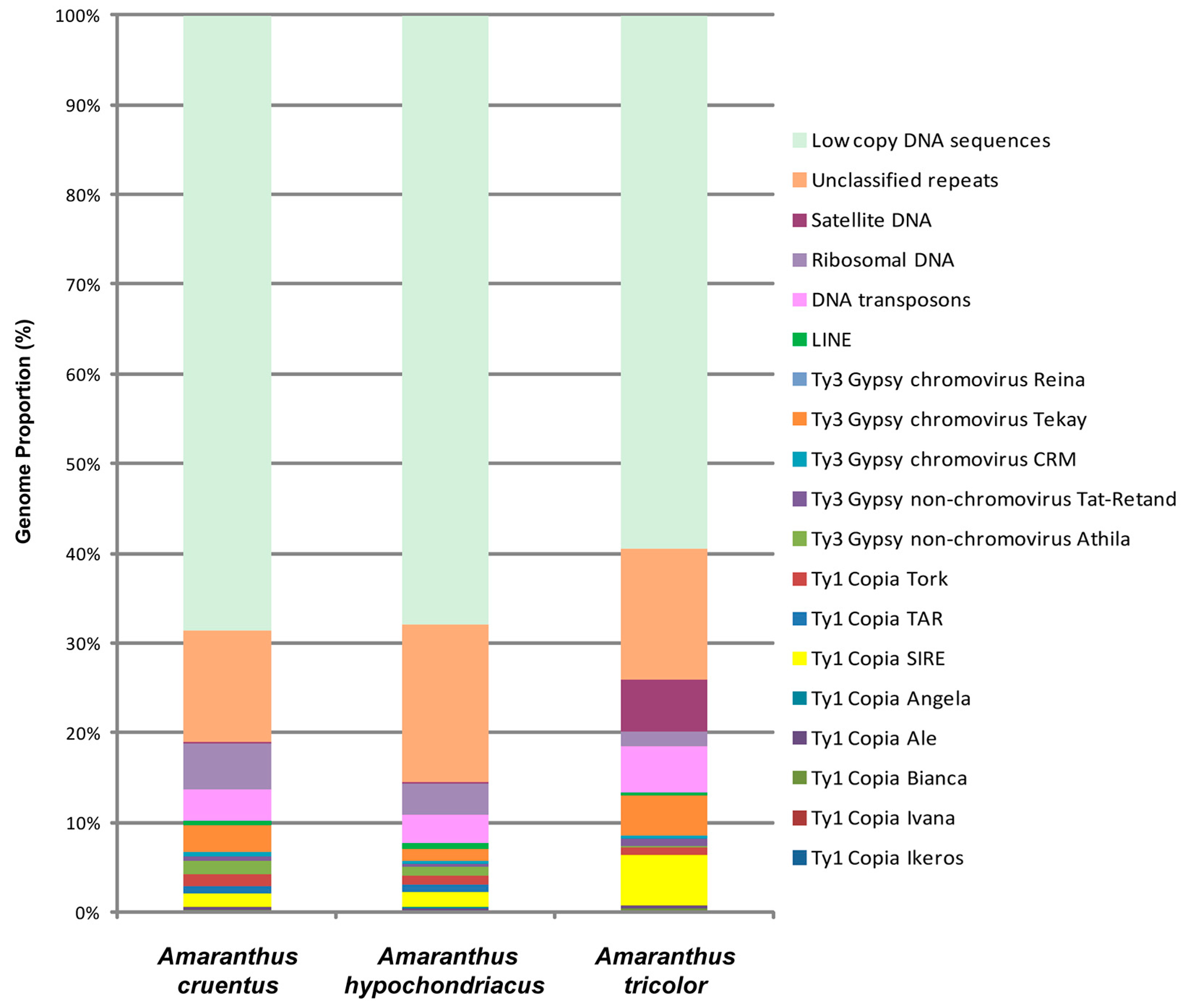 2.1. Comparative Analyses of DNA Repeats Identified in Genomes of A. tricolor, A. cruentus, and A. hypochondriacus
