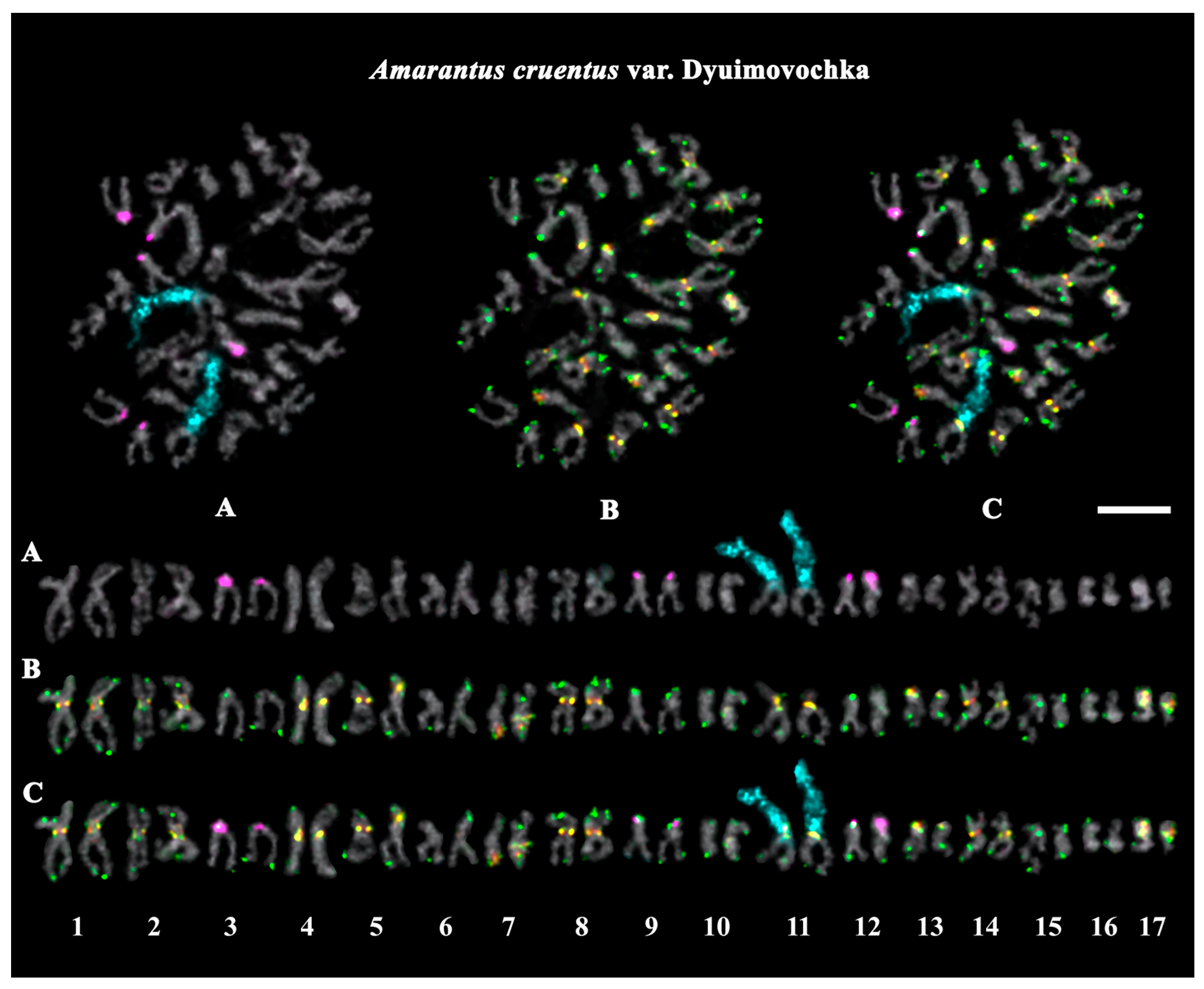 Amosova, A.V.; Yurkevich, O.Y.; Semenov, A.R.; Gins, M.S.; Kalnyuk, J.V.; Zemtsova, L.V.; Morozov, A.I.; Badaeva, E.D.; Zoshchuk, S.A.; Muravenko, O.V. Comparative Analysis of Chromosome Repeat DNA Patterns in Four Amaranthus Species. Int. J. Mol. Sci. 2025, 26, 11026. https://doi.org/10.3390/ijms262211026