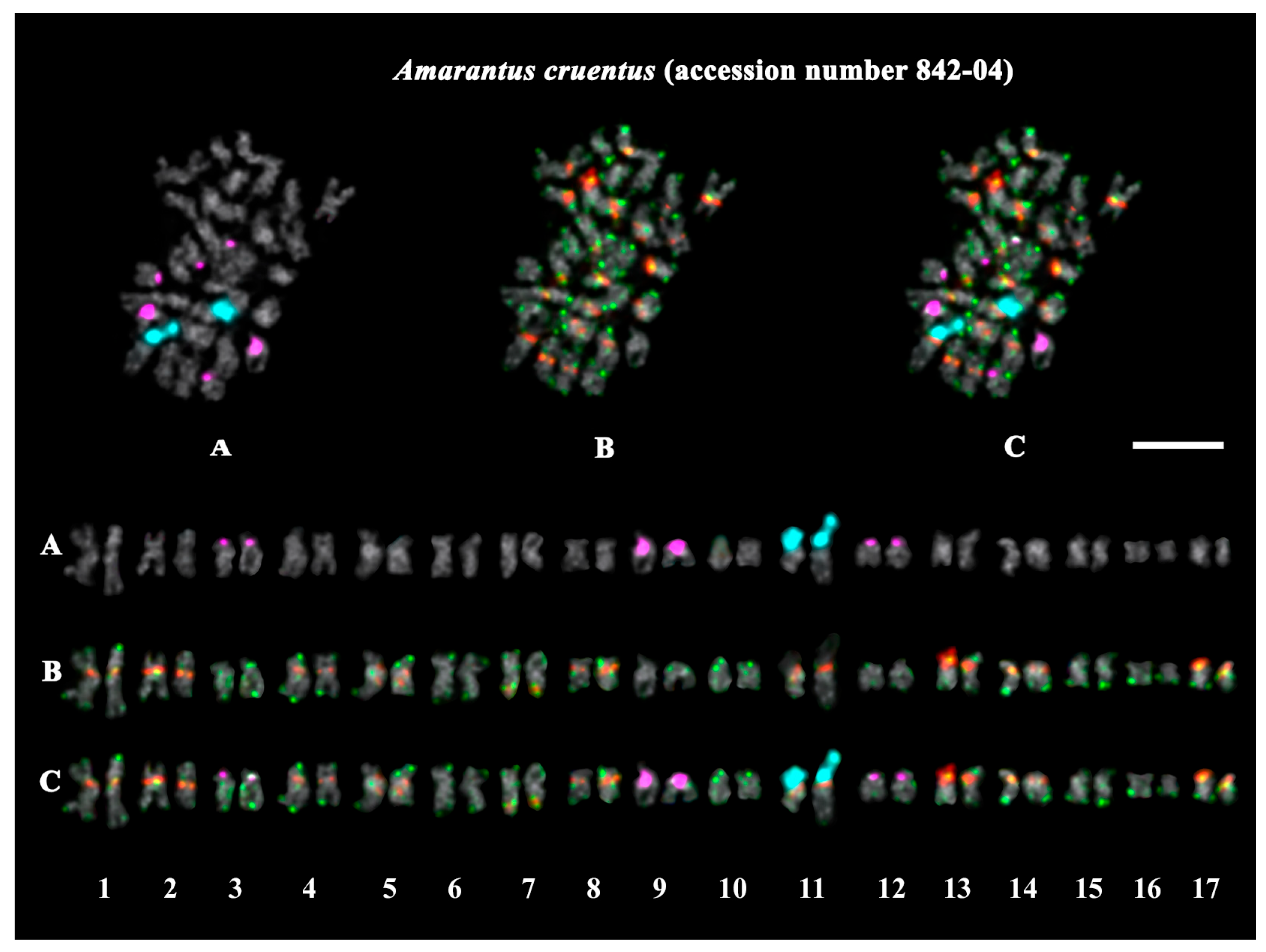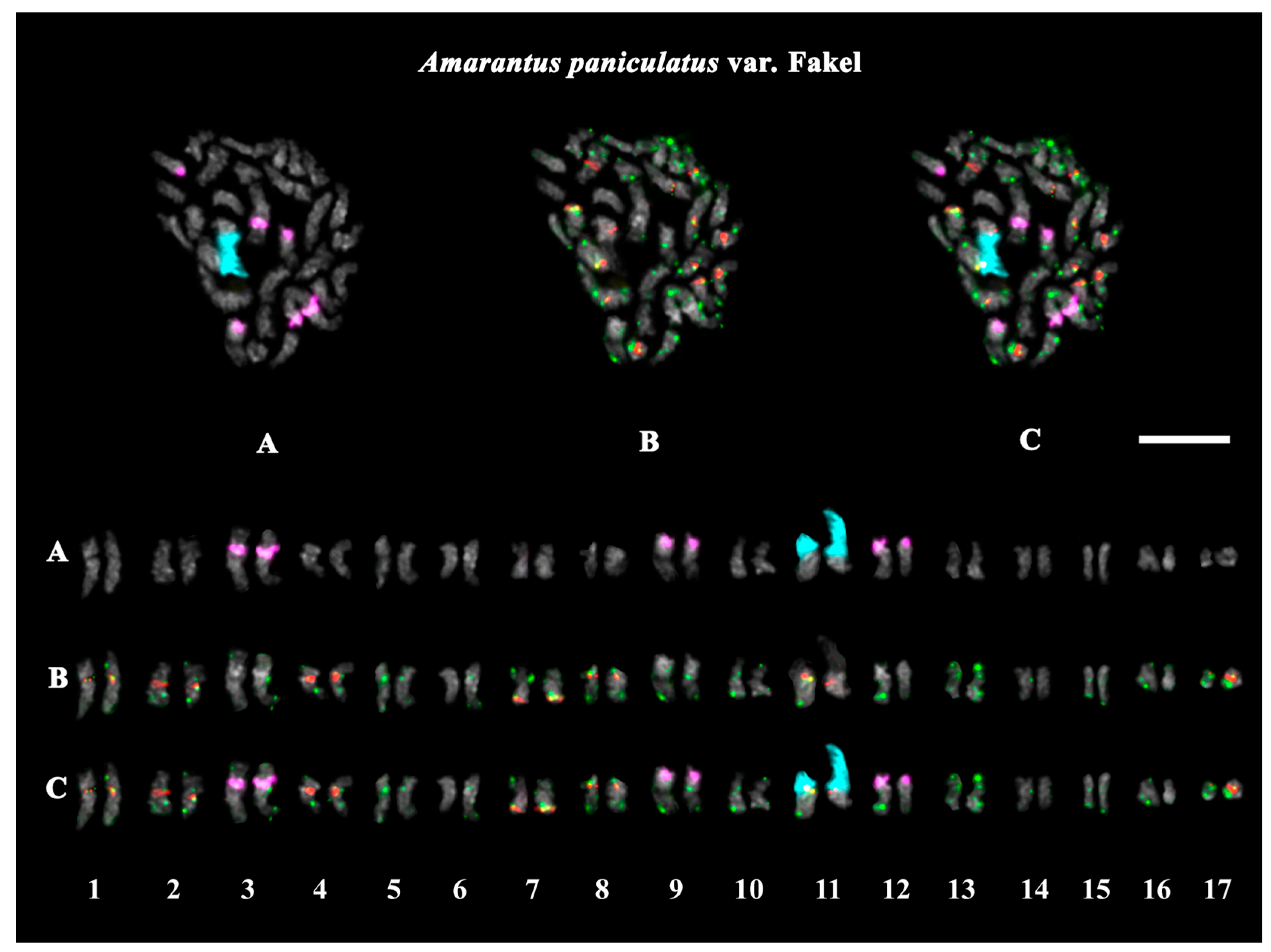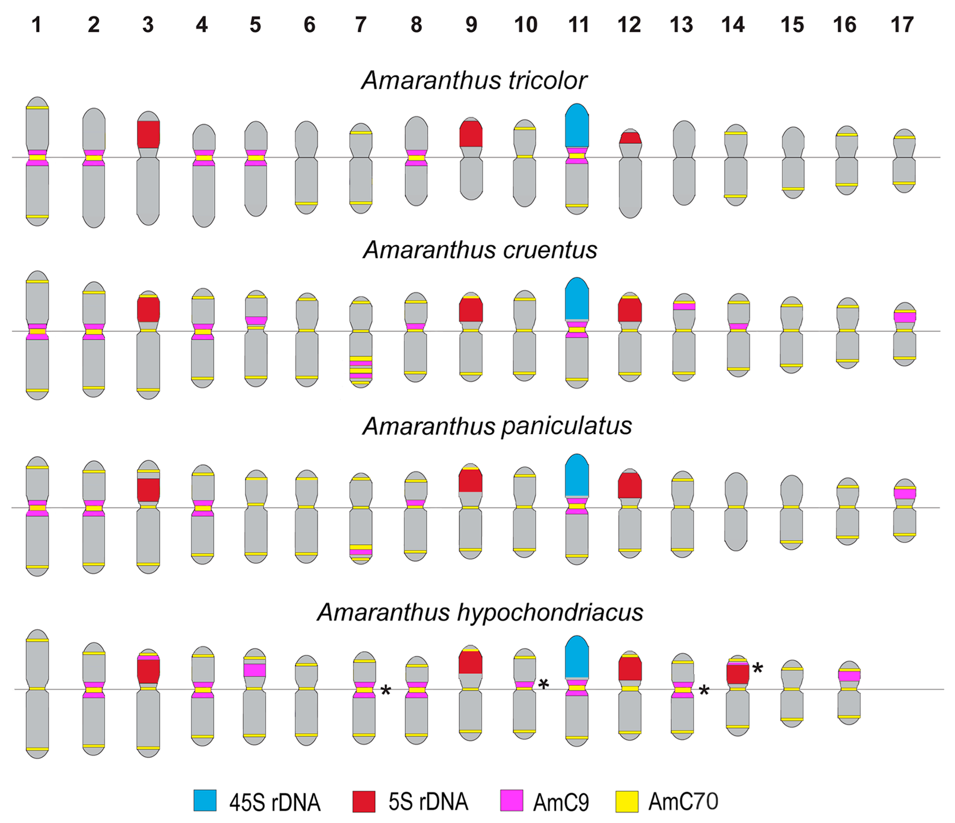 - Toma, F.N.; Bonna, I.J.; Hossen, R.; Alam, S.S.; Sultana, S.S. Comparative chromosome analysis of three Amaranthus species. Cytologia 2019, 84, 147–151. [Google Scholar] [CrossRef]