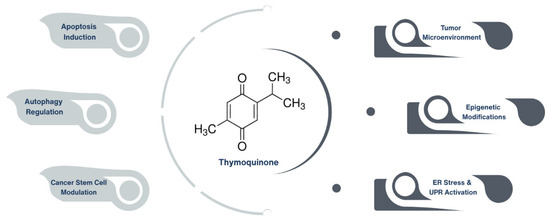 Emerging anticancer mechanisms of thymoquinone in preclinical studies. Thymoquinone, the primary bioactive constituent of Nigella sativa, exerts anticancer effects through multiple mechanisms, including apoptosis induction, autophagy regulation, and modulation of cancer stem cells. Additionally, it impacts the tumor microenvironment, influences epigenetic modifications, and activates endoplasmic reticulum (ER) stress and unfolded protein response (UPR) pathways.