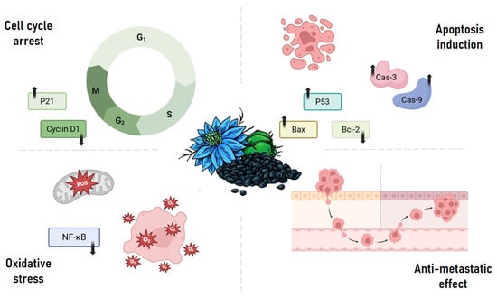 The anticancer properties of Thymoquinone (TQ) arise from its complex interactions with multiple oncogenic pathways. TQ exhibits diverse biological activities including anti-inflammatory, antioxidative, anti-angiogenic, and anti-metastatic effects, as well as the induction of apoptosis and regulation of multiple tumor suppressor genes. The compound primarily inhibits tumor cell proliferation through mechanisms such as cell cycle arrest, disruption of microtubule organization, and downregulation of cell survival proteins [16]. Furthermore, TQ’s proapoptotic activity involves mitochondrial dysfunction and caspase activation. It also modulates epithelial–mesenchymal transition (EMT) and targets cancer stem cells (CSCs), reducing metastatic potential and hindering cancer progression through its antioxidative properties [17] (Figure 2).
