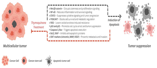 Mechanistic overview of thymoquinone’s action on cancer stem cells and tumor suppression. Thymoquinone exerts multi-targeted anticancer effects by modulating key signaling pathways involved in cancer stem cell (CSC) maintenance and tumor progression. TQ downregulates (↓) pathways that support stemness (Wnt/β-catenin), inflammation (NF-κB, STAT3), cell survival (PI3K/AKT), and metastasis (EMT markers such as vimentin, MMPs, and VEGF), while also reducing oxidative stress (ROS). Concurrently, it upregulates (↑) tumor suppressor proteins (p53, p21) and pro-apoptotic factors (Bax, Caspase-3) and inhibits anti-apoptotic regulators (Bcl-2, XIAP), thereby promoting apoptosis and tumor regression.