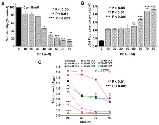 Dose-dependent effects of DCA on PANC-1 cell viability and proliferation. PANC-1 cells were seeded in 96-well plates at 2.0 × 103 cells/well in complete DMEM and incubated for 24 h at 37 °C to form monolayers. Cells were then treated with DCA at varying concentrations for the indicated times. Assays for cell viability, LDH release, and proliferation were performed as detailed in the Materials and Methods Section. (A) Cell viability was assessed by MTT assay following 24 h DCA treatment. Data were analyzed using GraphPad Prism v8.02, with IC50 determined using Quest Graph™ IC50 Calculator (AAT Bioquest). (B) LDH release into culture medium was quantified using CyQUANT™ LDH Cytotoxicity Assay Kit. LDH activity was calculated by subtracting background fluorescence from untreated controls and expressed in U/L. (C) Cell proliferation was monitored at 24, 48, 72, and 96 h post-DCA treatment using MTT assay. Data represent mean values ± SE (standard error) from at least 3 independent experiments, each performed in quadruplicate. The statistically significant difference and p-values were determined for all time points. However, the asterisks are shown only for the 24 h treatment for the sake of clarity.