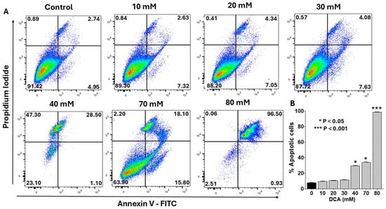 To determine whether the cytotoxicity observed with DCA (Figure 1) was mediated by apoptosis, we assessed early and late apoptotic events in PANC-1 cells using flow cytometry with an Annexin V-FITC/propidium iodide (PI) staining kit. As shown in Figure 2A, DCA treatment induced apoptosis in a concentration-dependent manner, with early and late stages evident in the lower- and upper-right quadrants, respectively. Low doses (10–30 mM) elicited minimal apoptosis, whereas higher concentrations (>30 mM) triggered a marked, dose-dependent increase primarily in late apoptosis. Quantitative analysis confirmed this trend, with total apoptotic cells increasing from <10% at 10 mM to >40% at 70 mM DCA (Figure 2B). These findings indicate that DCA-mediated cytotoxicity is predominantly driven by induction of apoptosis.