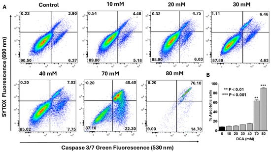 To determine whether DCA-induced apoptosis engages the intrinsic mitochondrial pathway, we evaluated the activation of caspases-3 and -7, canonical effectors of this cascade. As described in the Materials and Methods Section, flow cytometry analysis was performed using the CellEvent™ Caspase-3/7 Green Detection Reagent, a cell-permeant substrate comprising a DEVD peptide sequence conjugated to a nucleic acid-binding fluorogenic dye. Upon caspase-3/-7-mediated cleavage of the DEVD motif during apoptosis, the released dye binds DNA, yielding a bright signal with excitation/emission maxima at 502/523 nm. Co-staining with SYTOX™ AADvanced™ Dead Cell Stain enabled discrimination of early/late apoptotic cells (caspase-positive, SYTOX-negative) from viable (double negative) and necrotic (double positive) populations. Representative flow cytometry plots (Figure 3A) revealed a dose-dependent increase in caspase-3/-7 activation, marked by progressive shifts toward the early (lower-right quadrant) and late (upper-right quadrant) apoptotic fractions. Quantitative analysis of pooled data (Figure 3B) confirmed that total apoptosis remained modest at ~15% with 40 mM DCA but escalated markedly at higher concentrations (e.g., >60% at 70 mM). These findings indicate that DCA elicits dose-dependent apoptosis through activation of the intrinsic mitochondrial pathway, highlighting its potential as a modulator of PANC-1 cell fate.