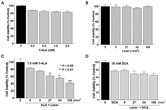 Effects of 5-ALA and laser alone and combinations with DCA on cell viability. PANC-1 cells were seeded into 96-well plates at a density of 2.0 × 103 cells/well in complete DMEM and grown for 24 h at 37 °C to form monolayers. Cells were then treated with a single agent or in combination with DCA, and cell viability was determined using MTT assay as described in the Materials and Methods Section. (A) Effect of 5-ALA treatment alone at the indicated concentrations for 4 h. (B) Effect of laser irradiation alone at the indicated fluences. (C) Single-agent treatment, as well as the effect of PDT, a combination of 1.0 mM 5-ALA for 4 h, and the indicated fluences of laser irradiation. (D) Combined effect of laser irradiation at the indicated fluences (without 5-ALA treatment) followed by treatment with sub-toxic dose of 30 mM DCA for 24 h. Data shown are means ± SE from three independent experiments, each performed in quadruplicate. Asterisks denote significant differences compared with the control.