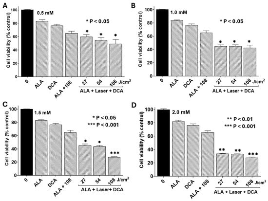 For PDT experiments, cells were incubated with freshly prepared 5-ALA at concentrations of 0.5, 1.0, 1.5, or 2.0 mM in serum-free medium for 4 h at 37 °C. At the end of 4 h incubation with 5-ALA, cells were exposed to infrared laser fluences of 9, 27, 54, or 108 J/cm2. This constituted the standard PDT protocol (5-ALA + laser) that we followed in our experimental model. After irradiation, cells were washed with PBS and incubated with or without DCA for 24 h. After incubation, cell viability was assessed using the MTT assay as described before. For additional experiments using combined treatments, 5-ALA was used at a pre-determined concentration of 1.0 mM and laser dosing of 54 and 108 J/cm2. In experiments where the combined effect of PDT + DCA was assessed, PDT treatment was carried out as described before, followed by 30 mM DCA in 100 µl of complete DMEM. At the end of each experiment, cell viability/cytotoxicity was assayed by MTT as described before, and these experiments were repeated three times [21].